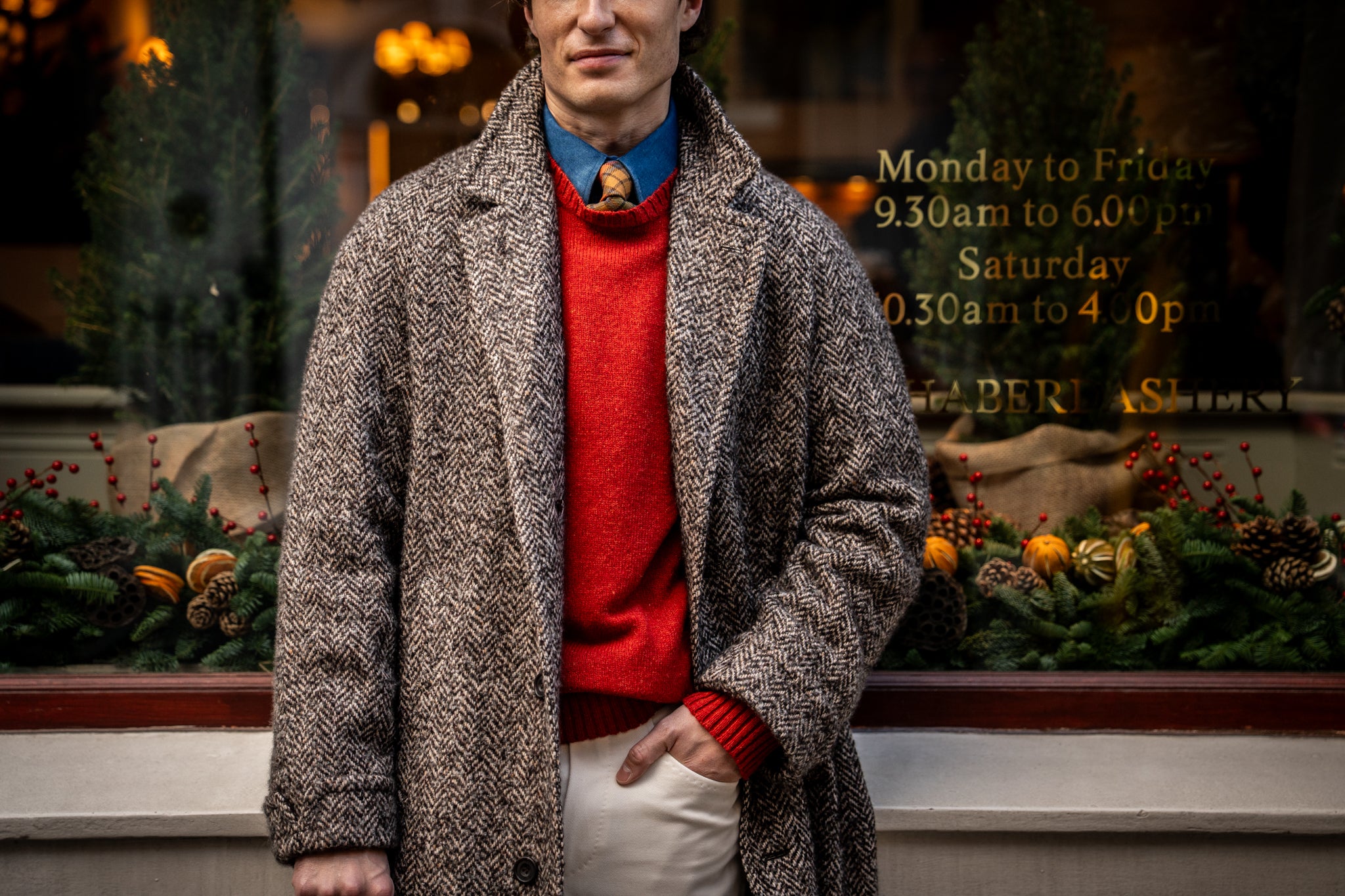 Woven form a blend of wool, cashmere and silk this herringbone overcoat features a raglan sleeve and deep middle back vent creating a flattering silhouette with easy movement. It can be layered over a jacket for a slightly smarter feel or with a heavy knit sweater for a casual weekend look.