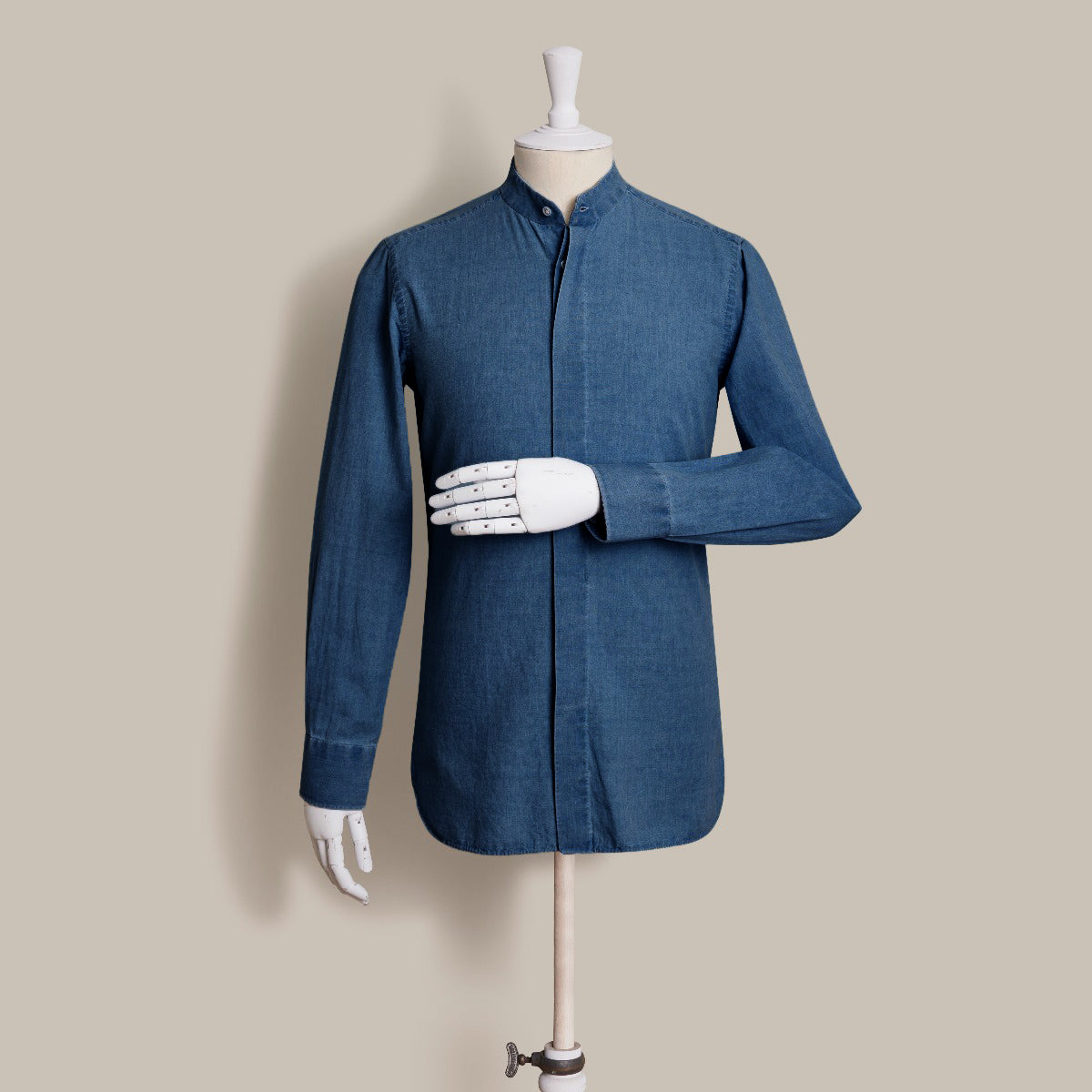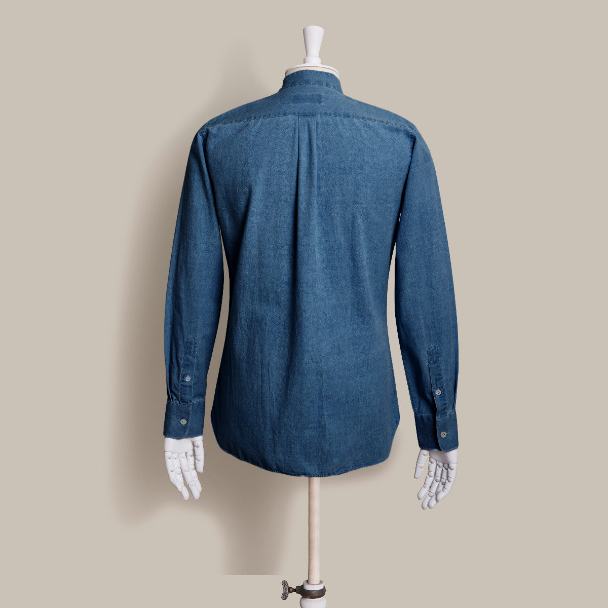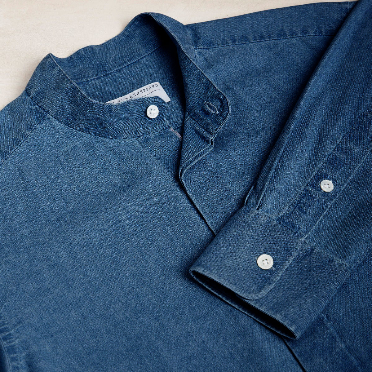 100 Hands For Anderson & Sheppard Handmade Collarless Chambray Shirt In Mid Blue