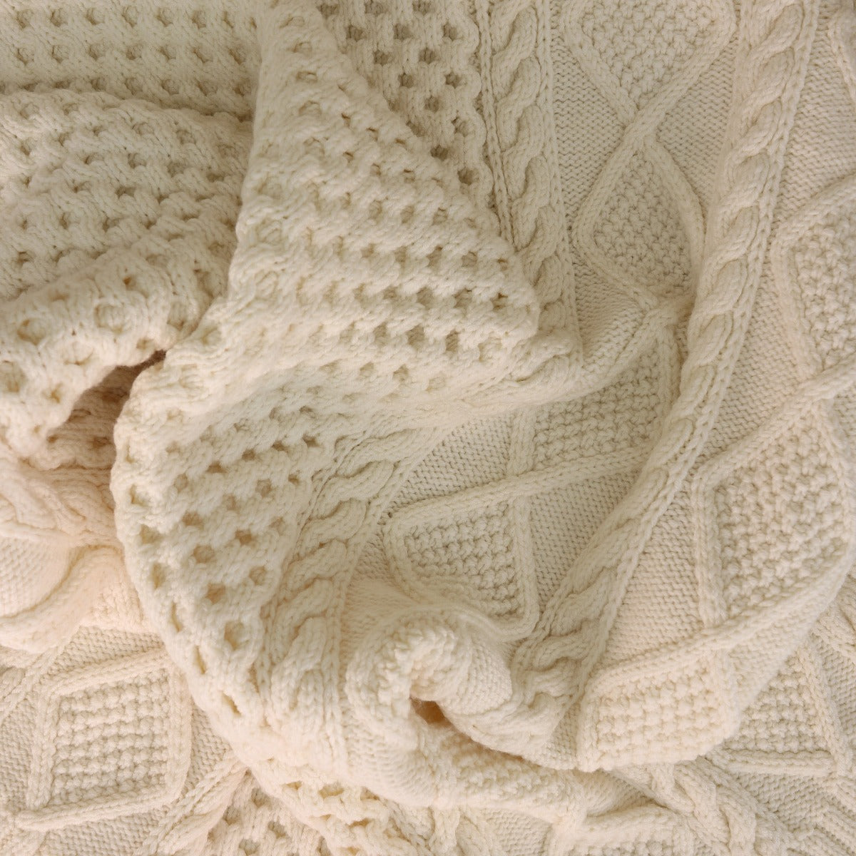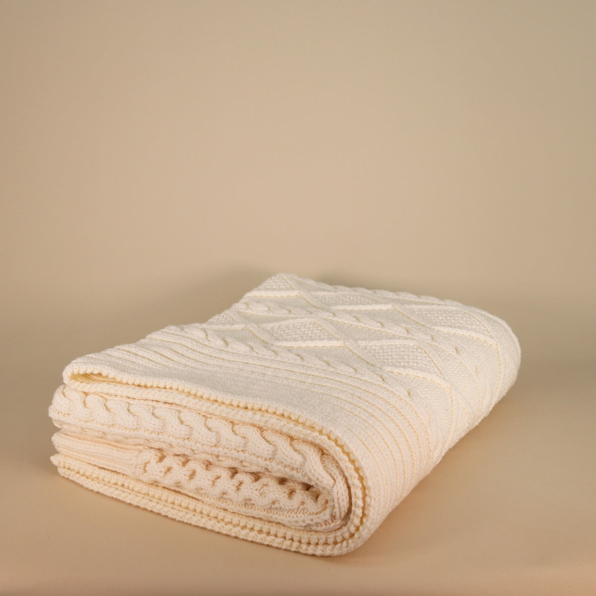 A hand knitted, waffle cable blanket with deep ribbed edges. Draping beautifully over a sofa or bed this elegant piece will add a cosy touch to your home. Made of 100% merino wool.