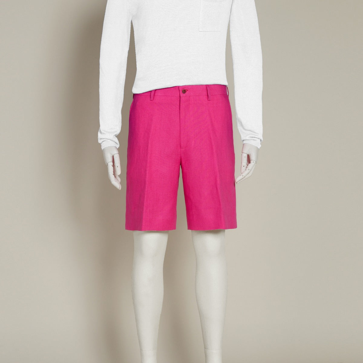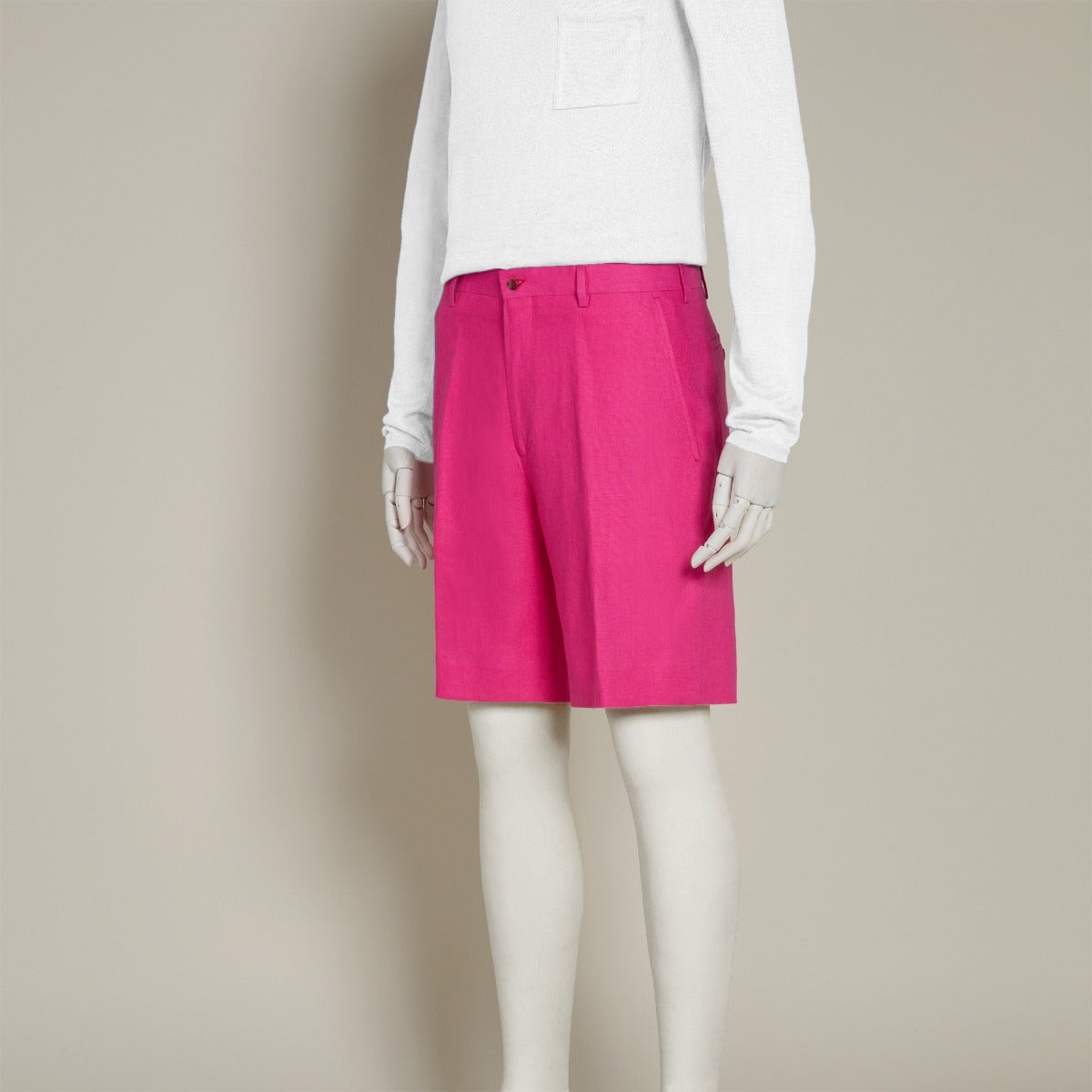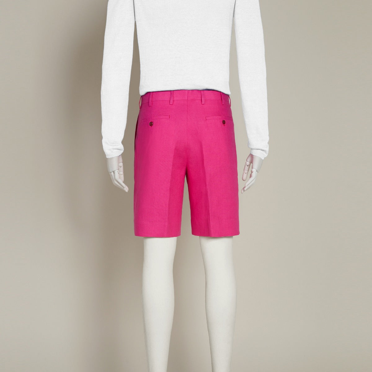 These Irish linen summer shorts are made in Italy. They are knee length with a flat front, a zip fly and belt loops. The shorts have a variety of useful pockets: two slanted side pockets; two buttoned back pockets and two internal zipped pockets for small change and bank cards. They are available in a wide range of colours.