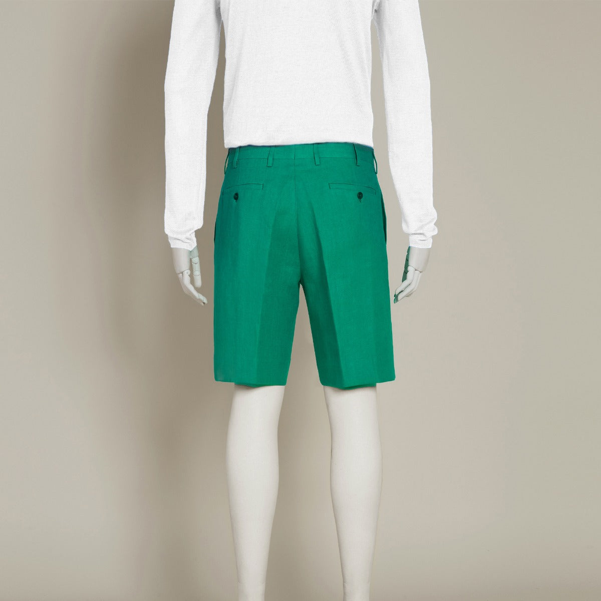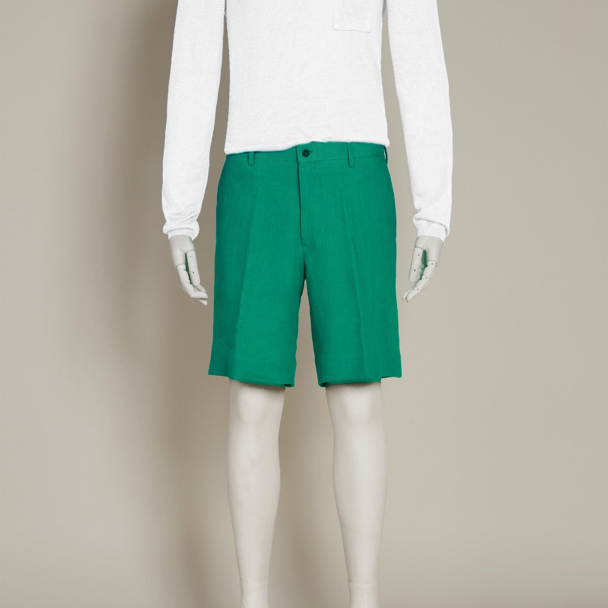 These Irish linen summer shorts are made in Italy. They are knee length with a flat front, a zip fly and belt loops. The shorts have a variety of useful pockets: two slanted side pockets; two buttoned back pockets and two internal zipped pockets for small change and bank cards. They are available in a wide range of colours.