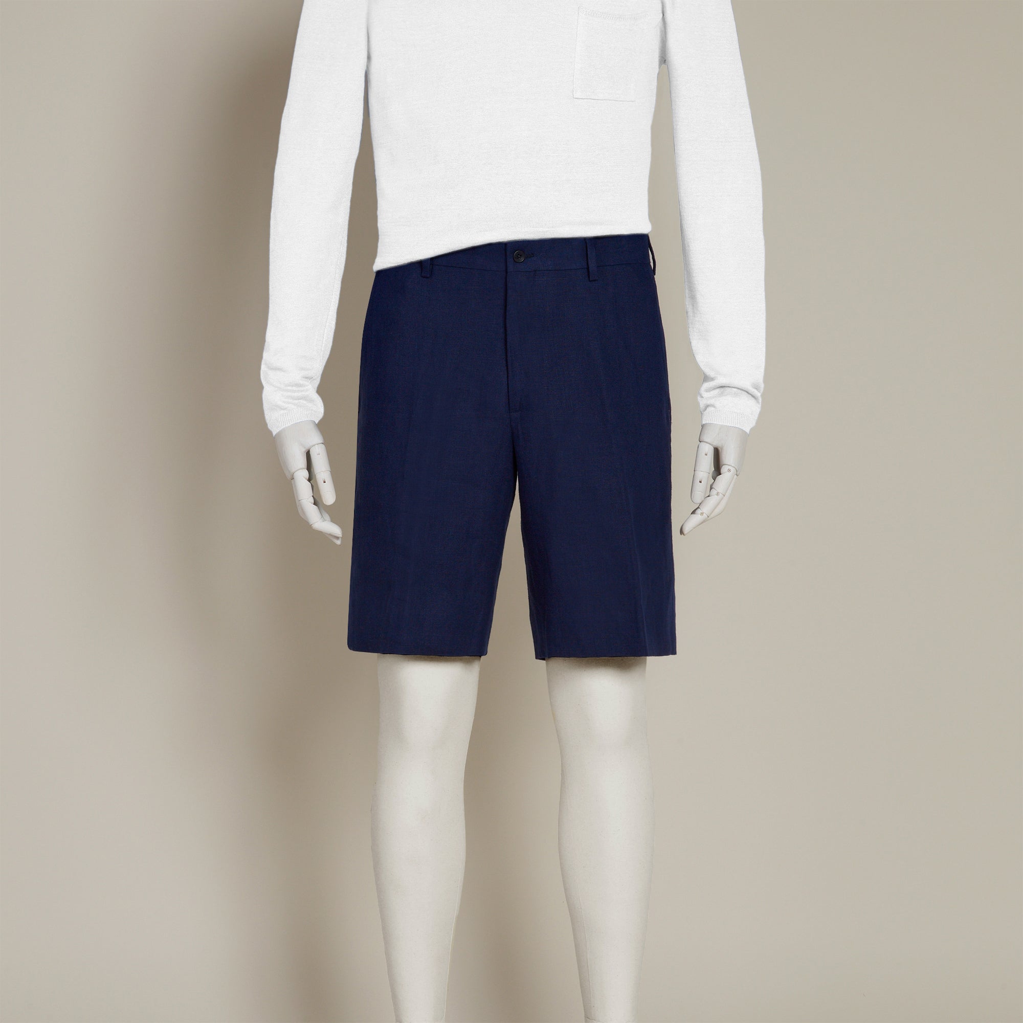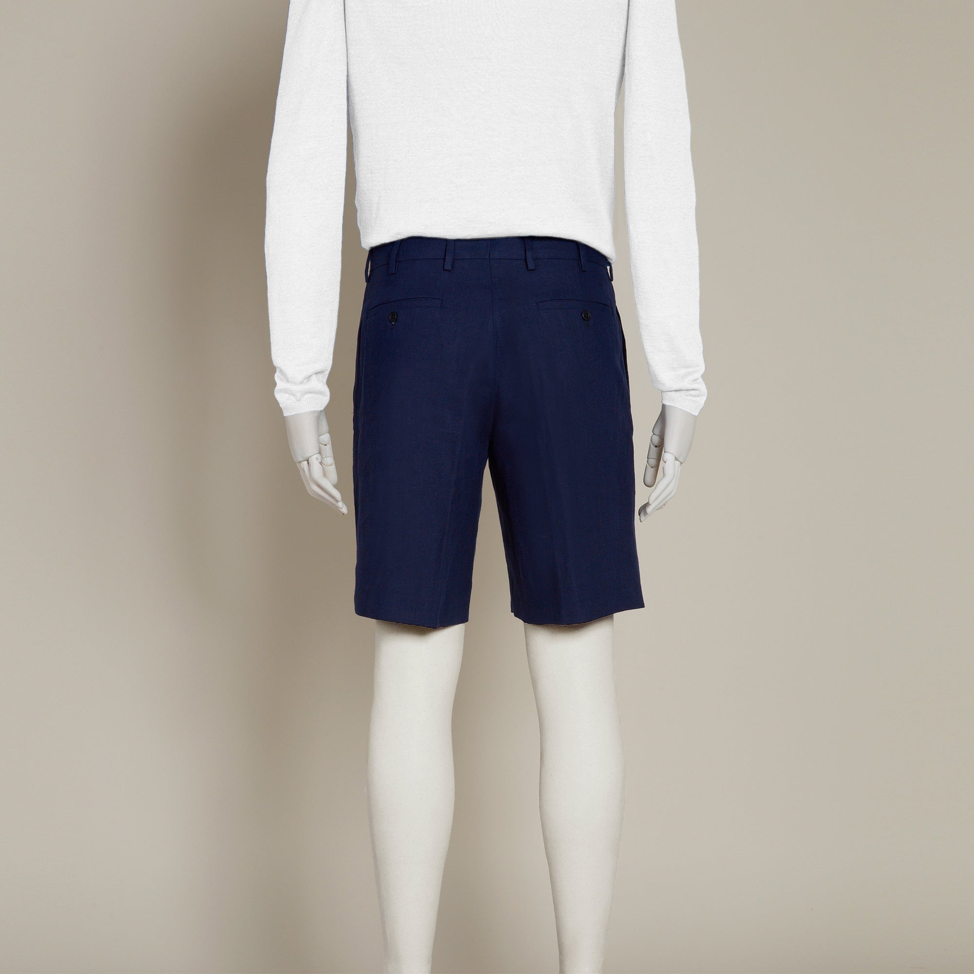These Irish linen summer shorts are made in Italy. They are knee length with a flat front, a zip fly and belt loops. The shorts have a variety of useful pockets: two slanted side pockets; two buttoned back pockets and two internal zipped pockets for small change and bank cards. They are available in a wide range of colours.