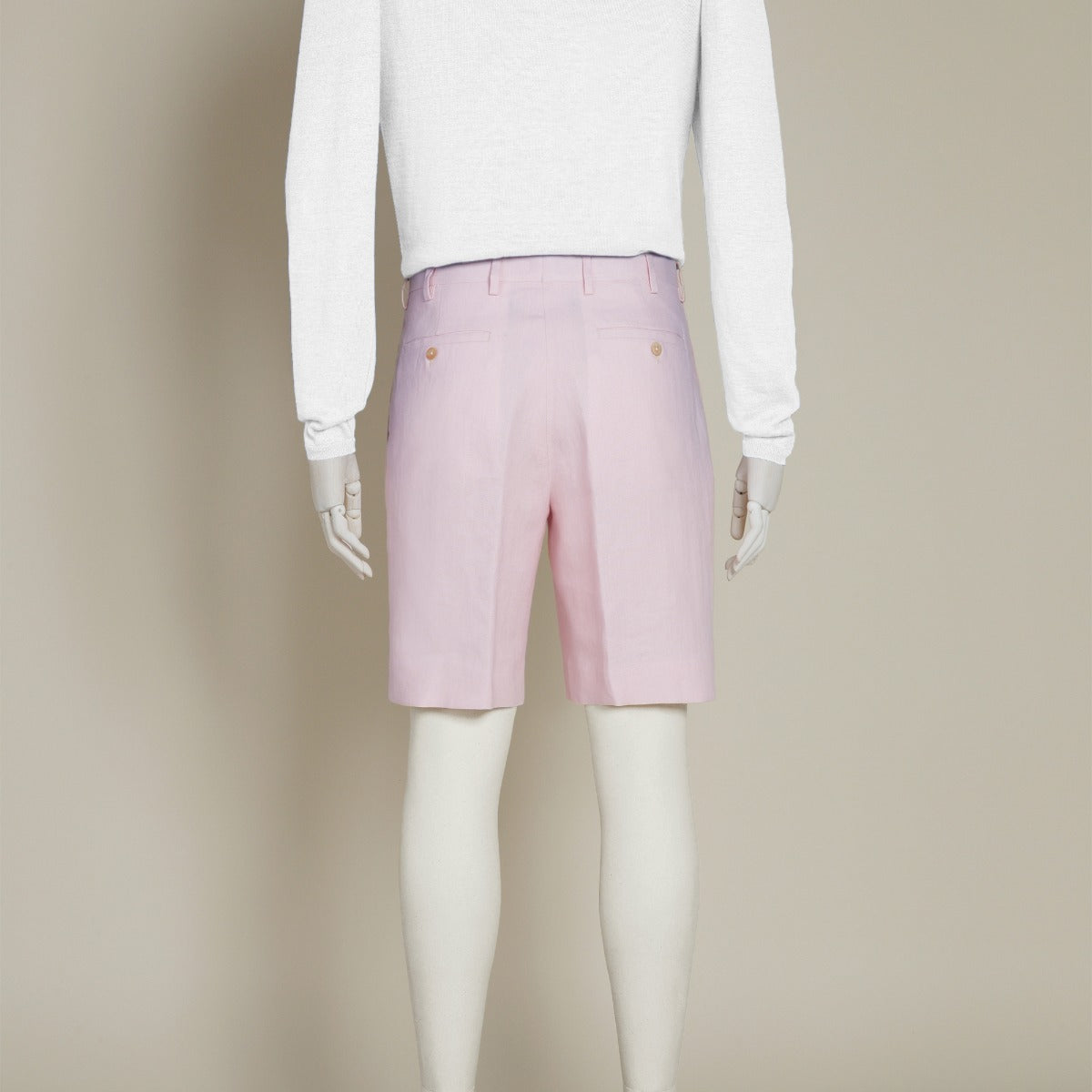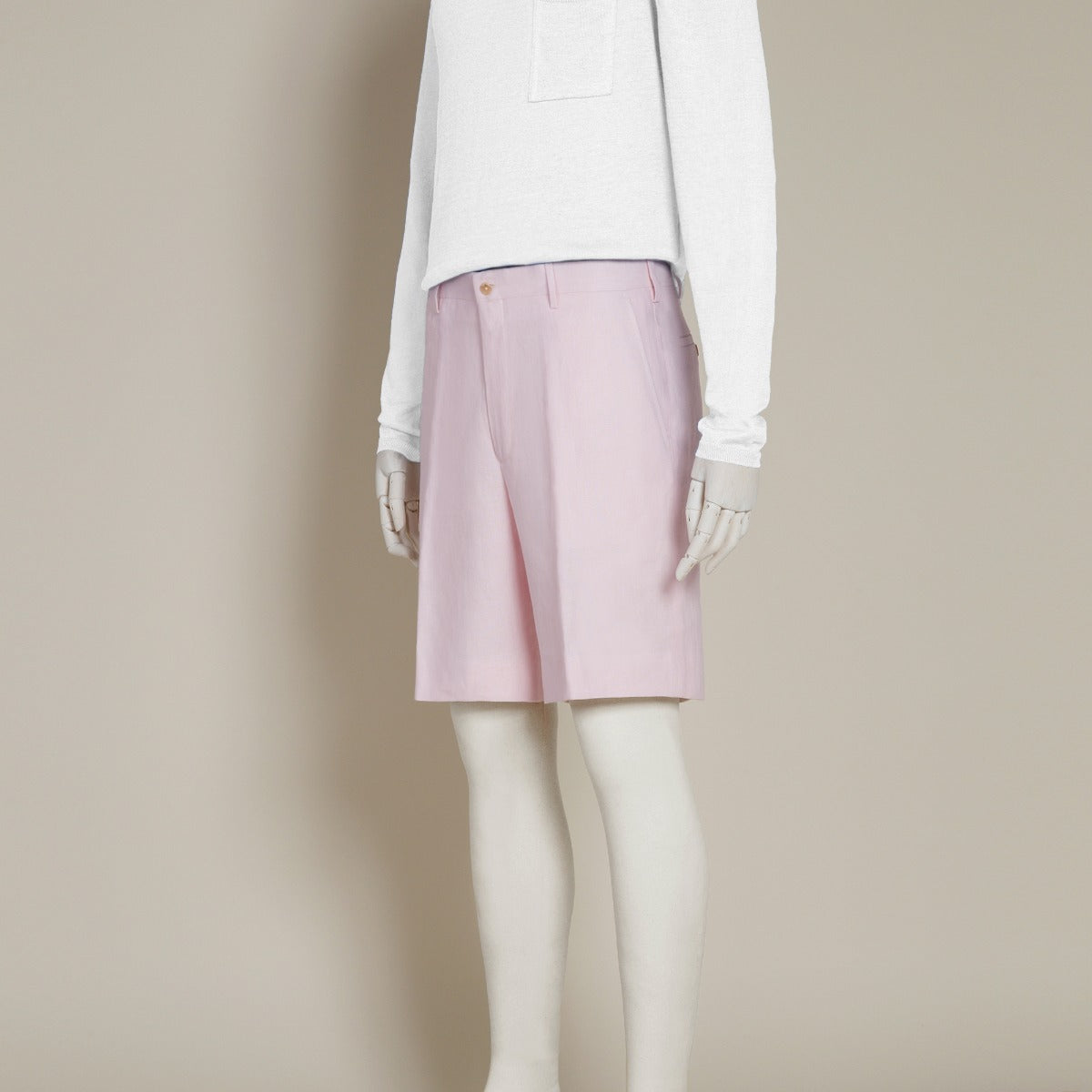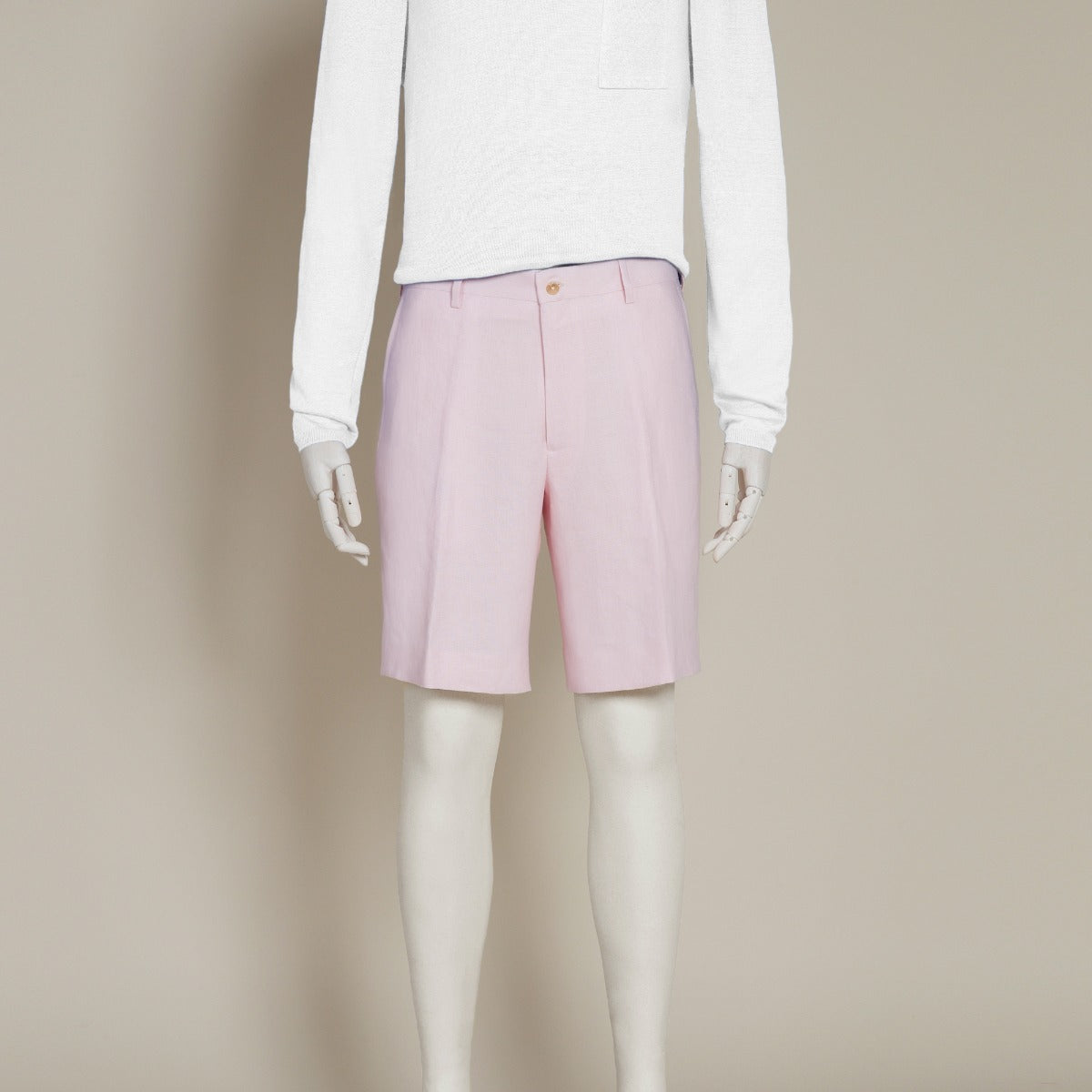 These Irish linen summer shorts are made in Italy. They are knee length with a flat front, a zip fly and belt loops. The shorts have a variety of useful pockets: two slanted side pockets; two buttoned back pockets and two internal zipped pockets for small change and bank cards. They are available in a wide range of colours.