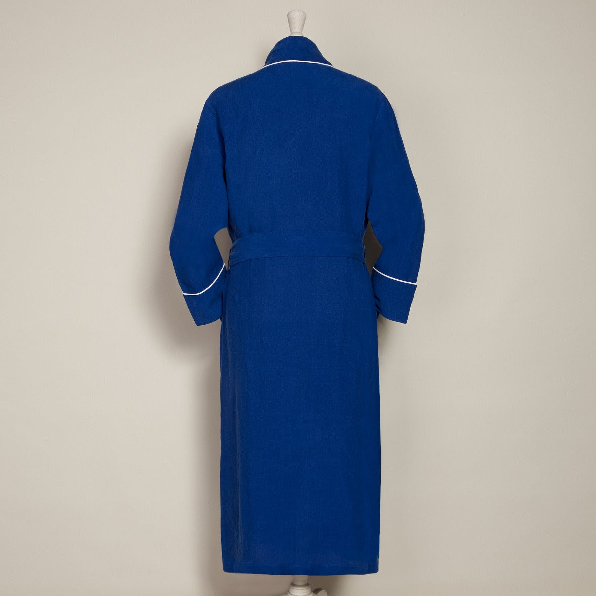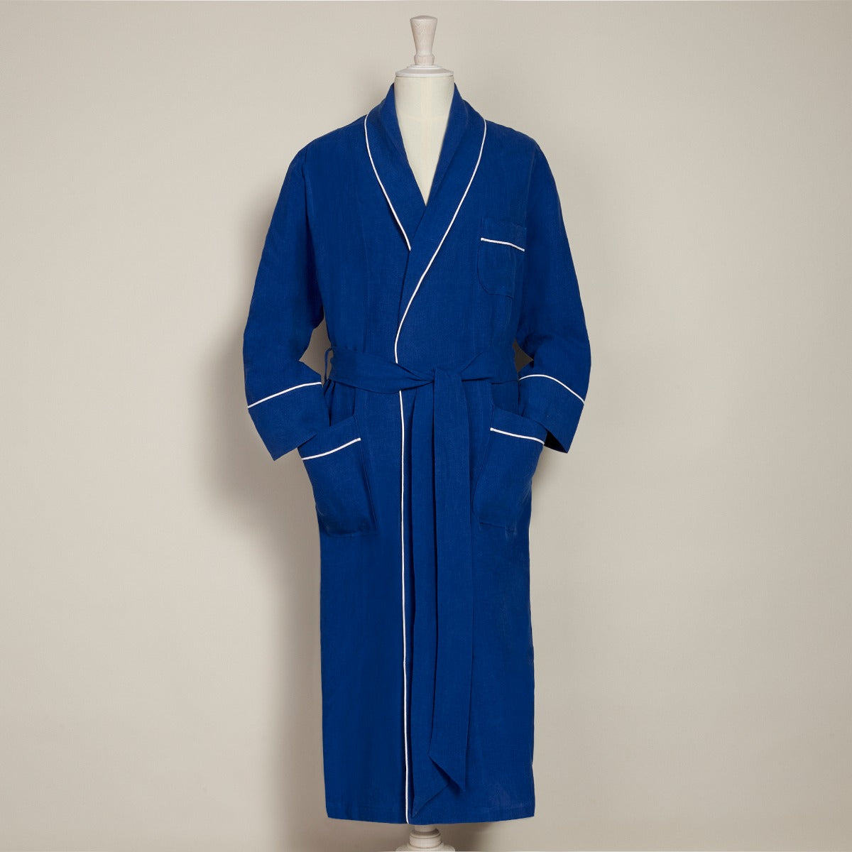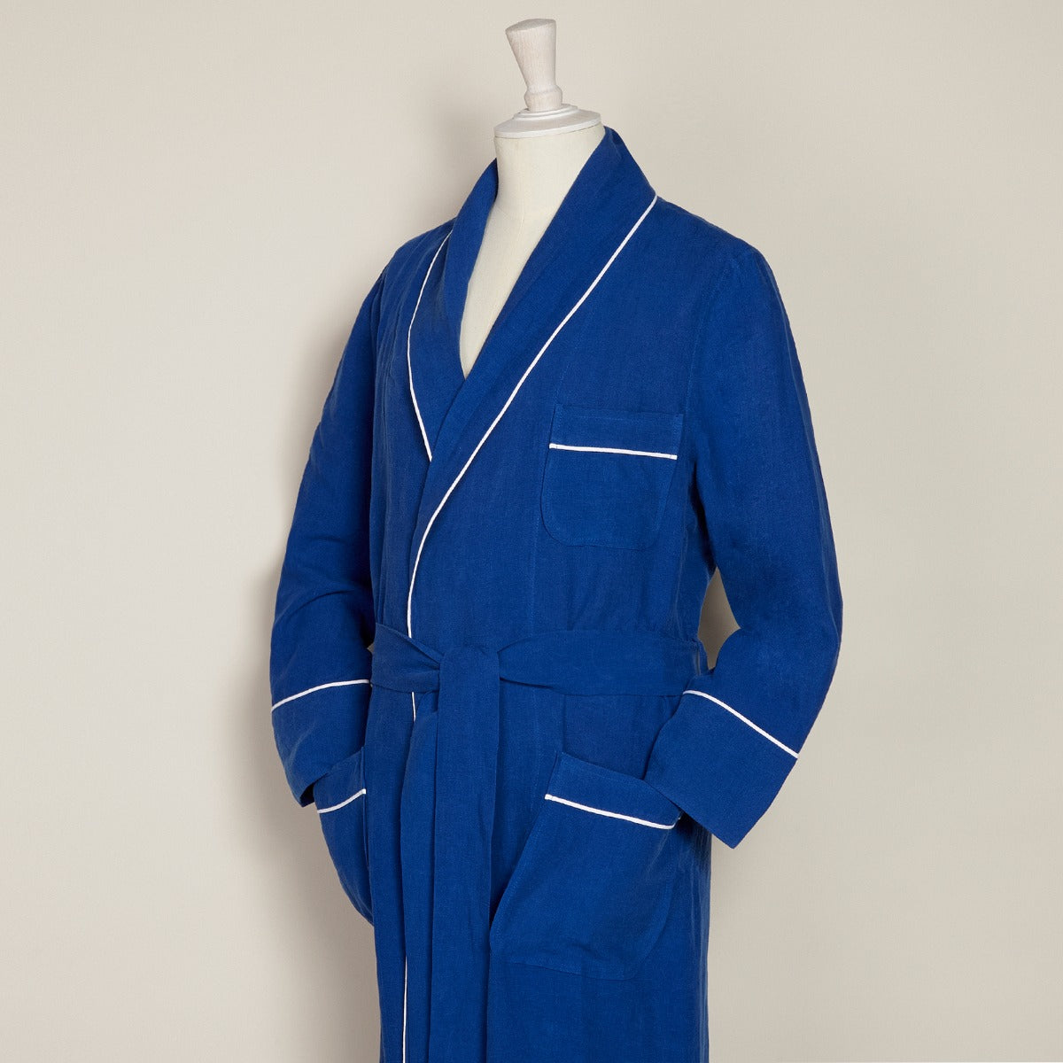 This shawl collar Italian linen dressing gown is belted and features three patch pockets. A generous wrap means you will never feel restricted, making it extremely comfortable, and you can be sure it will never flap open because of two internal ties.
