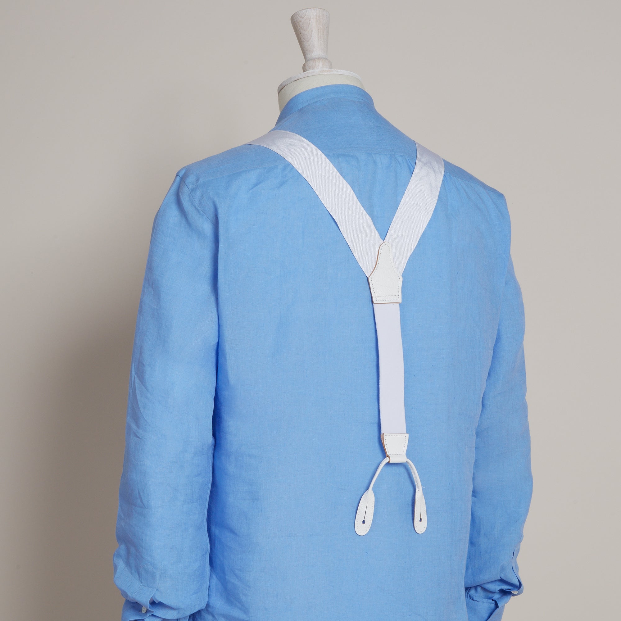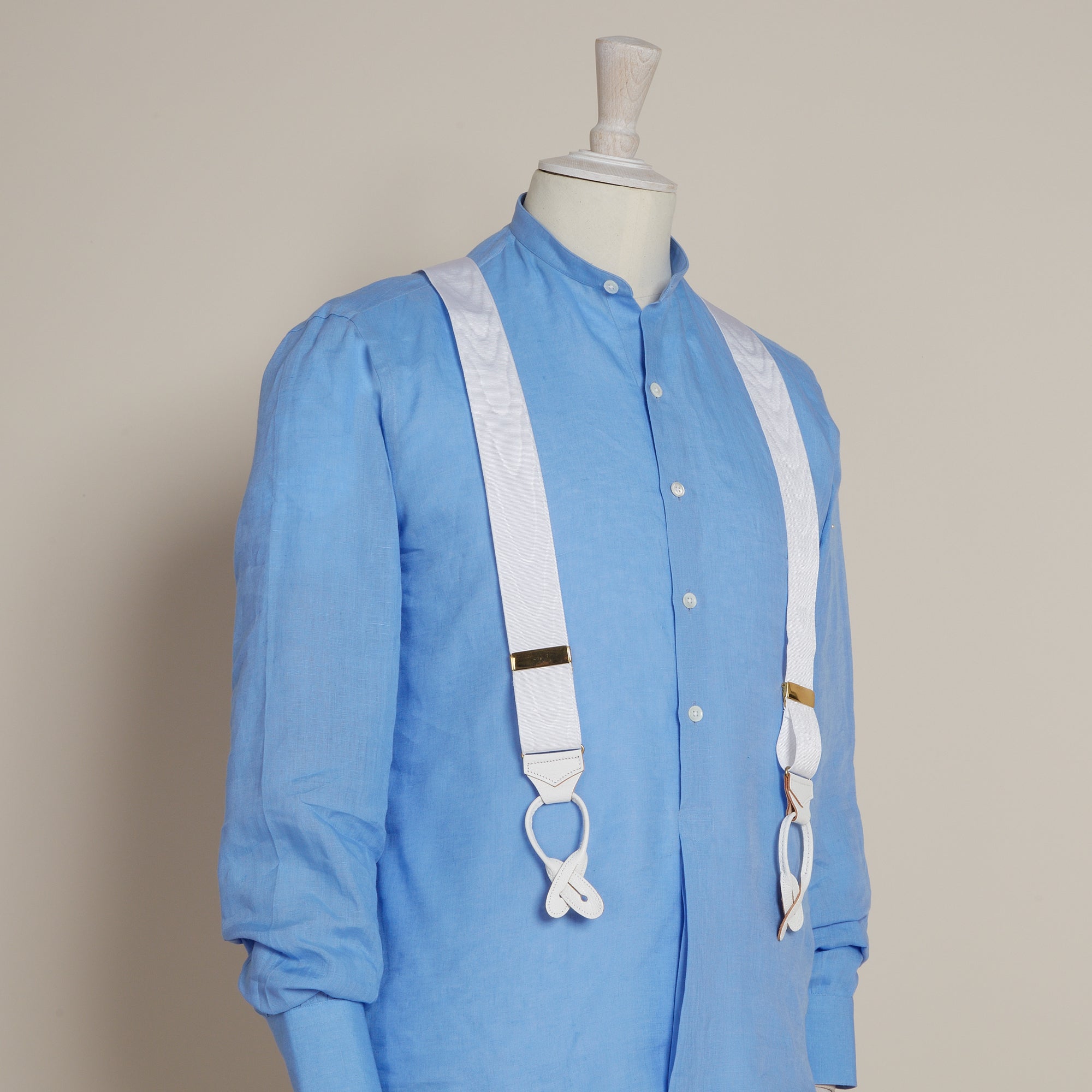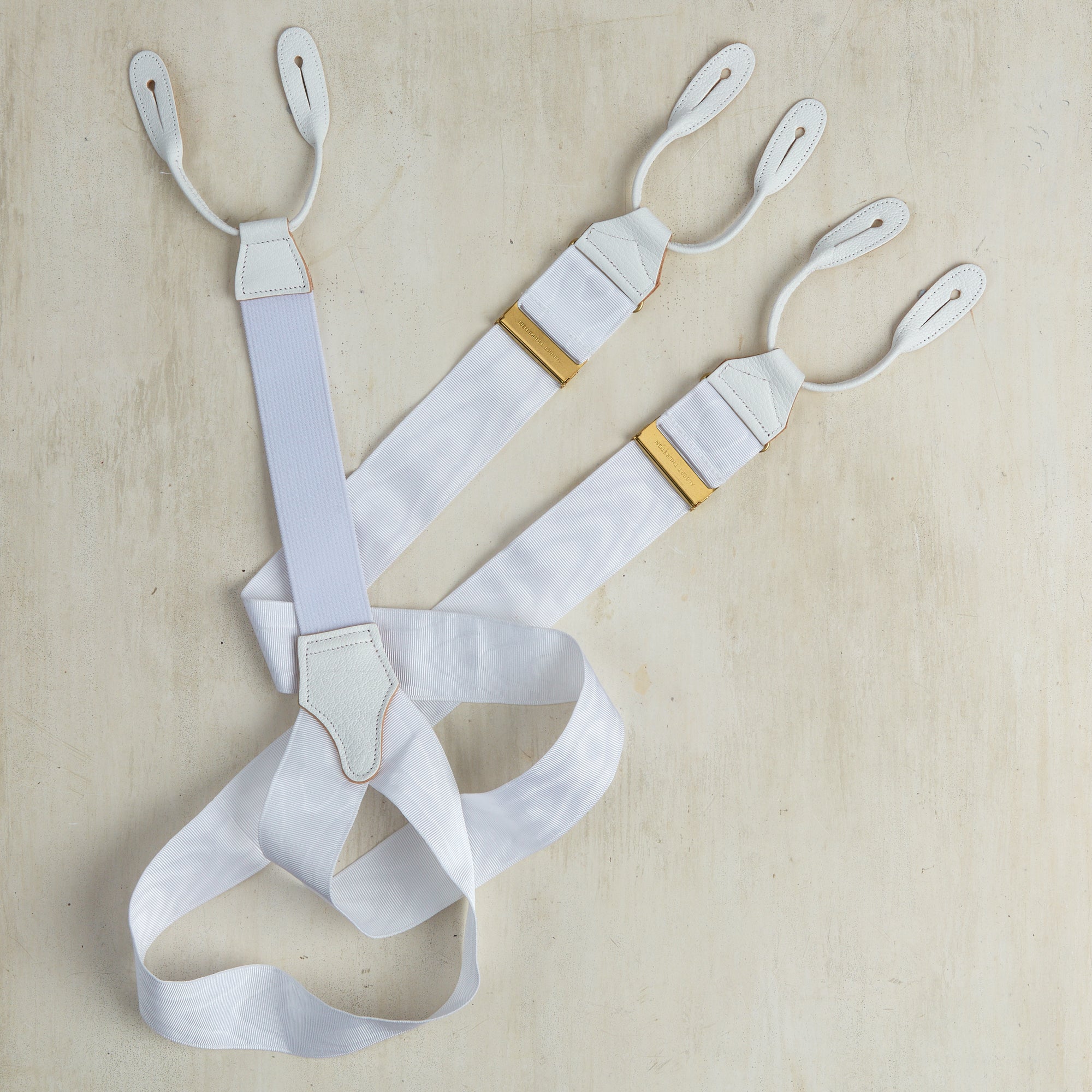 These moire silk braces are made by the oldest manufacturer of braces in the world. The watered silk is genuine moire which reacts to light and movement. The braces have a traditional button fitting with white leather ends. The length of the straps are altered by narrow brass adjusters.