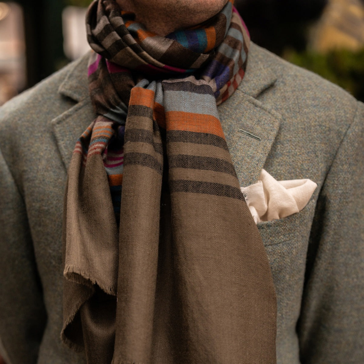 Multi Stripe Cashmere Scarf In Taupe And Red