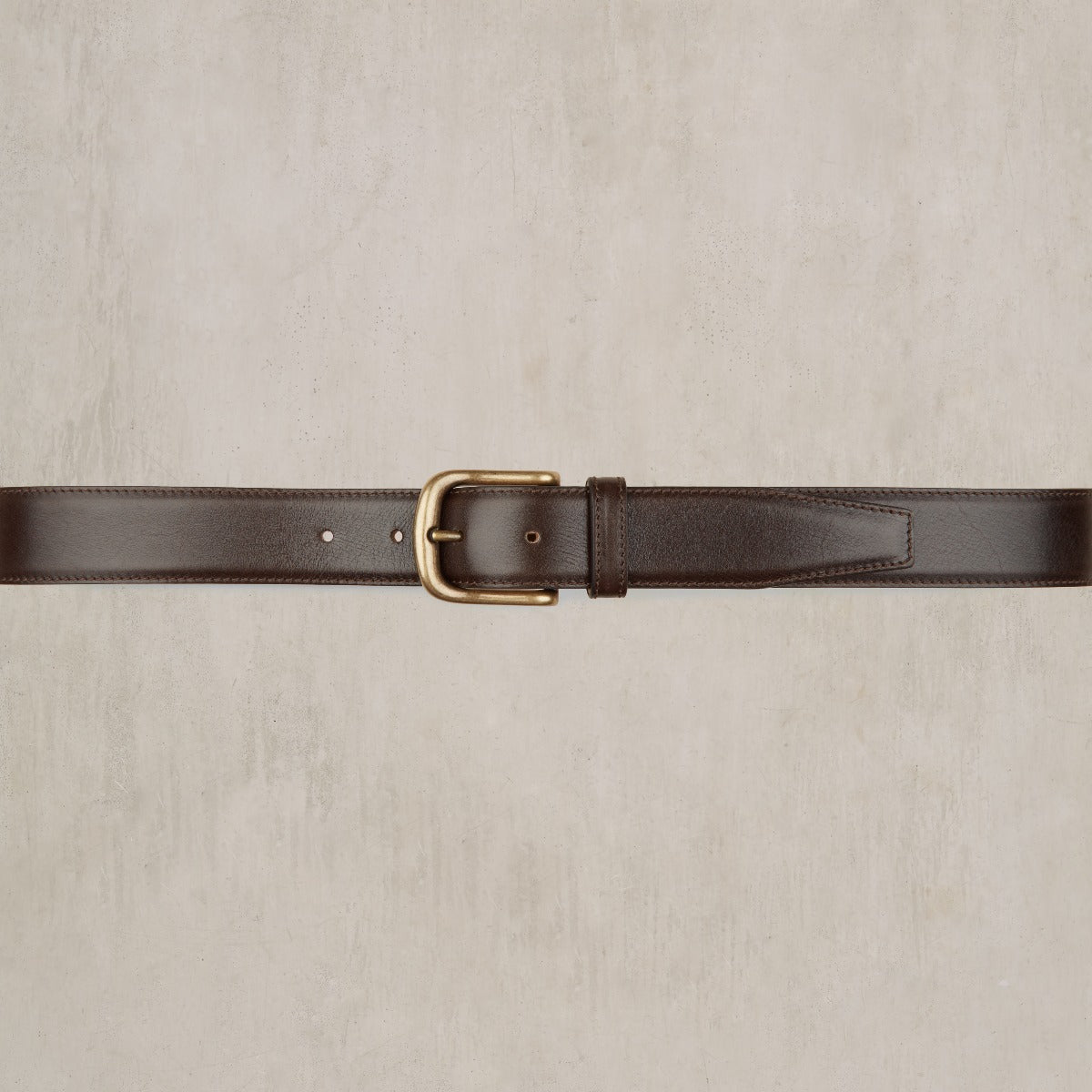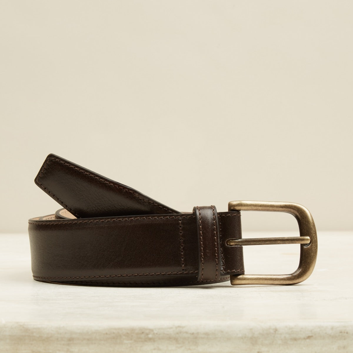 This nappa leather belt in dark brown is made from luxurious and smooth calf skin leather. It has an antique brass buckle and top stitched ends, which makes this belt an ultimate versatile piece in your wardrobe. Wear it with chinos or jeans for a stylish casual look.