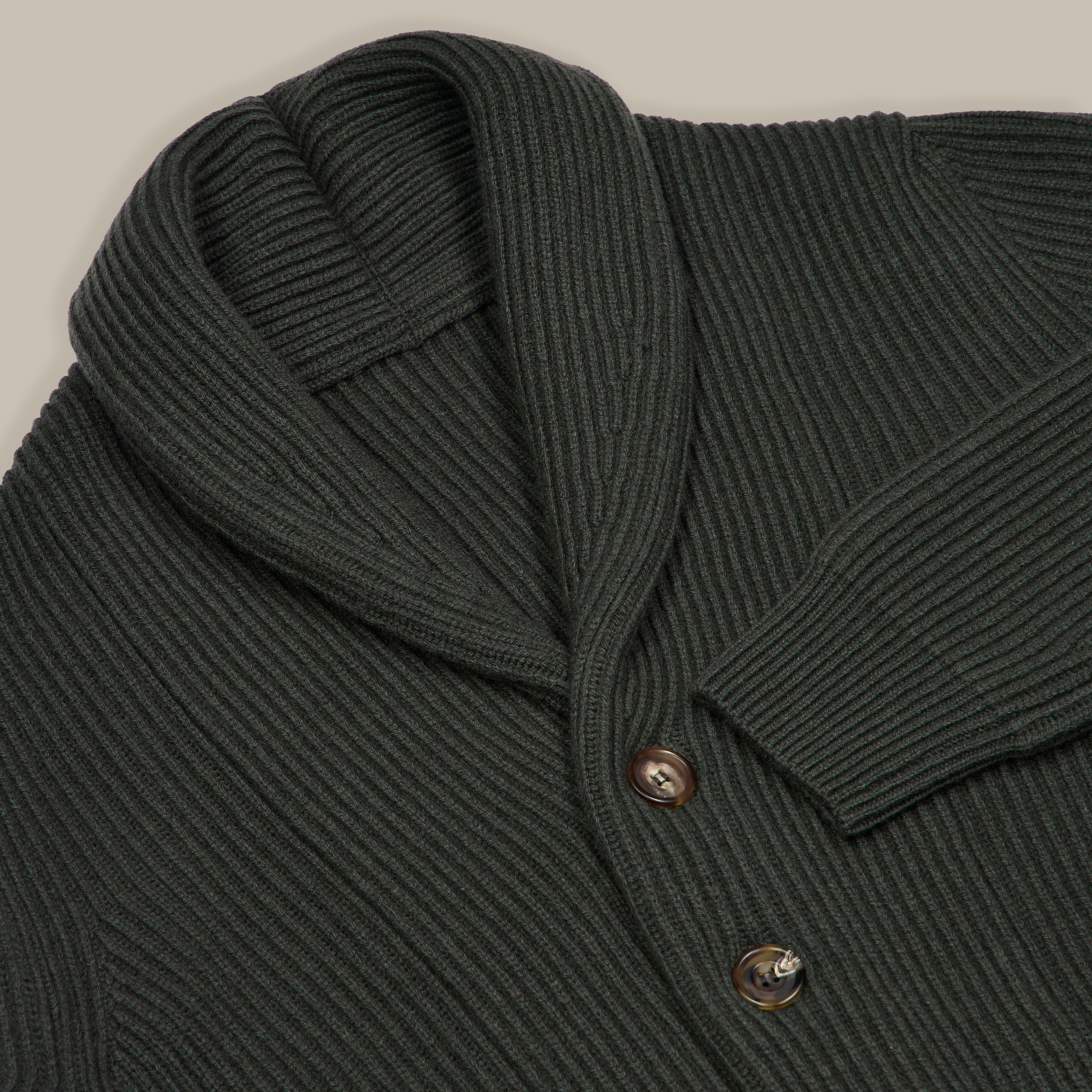A perfect layering piece this ribbed shawl neck cardigan in dark green can be worn as a substitute for an autumnal jacket or under an overcoat for colder winter days. It is made from soft merino wool with a little cashmere.