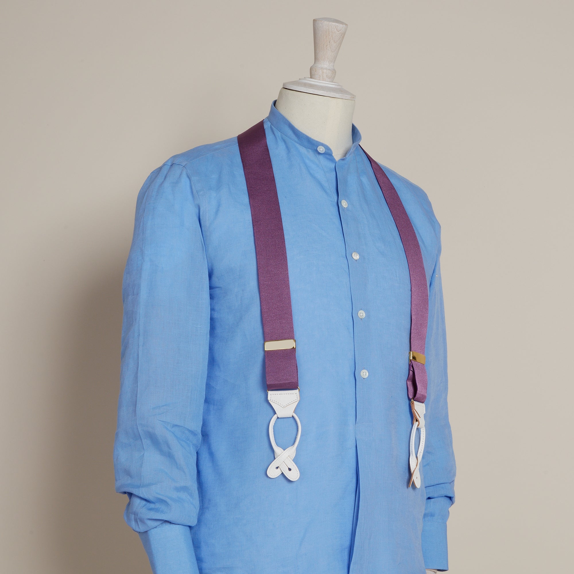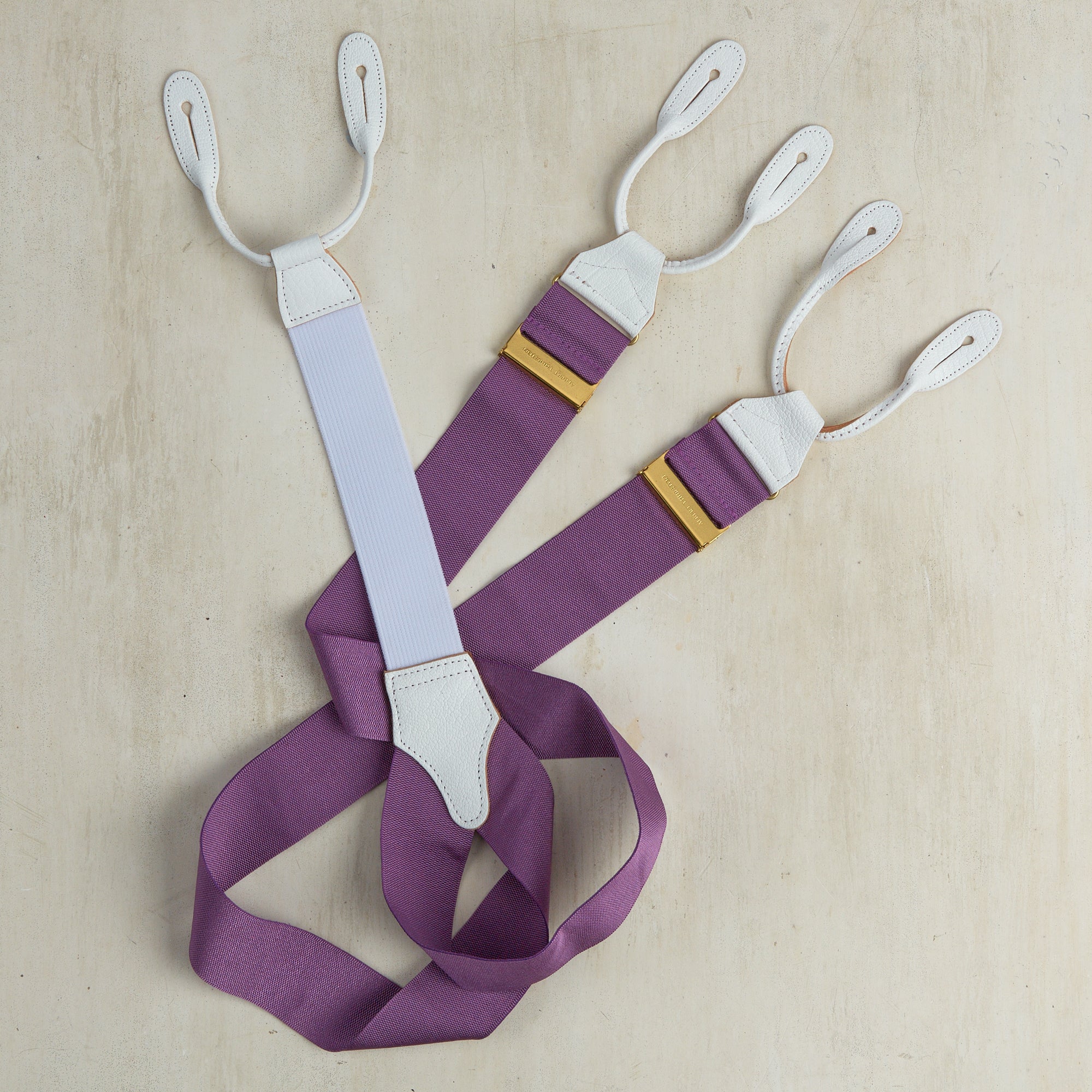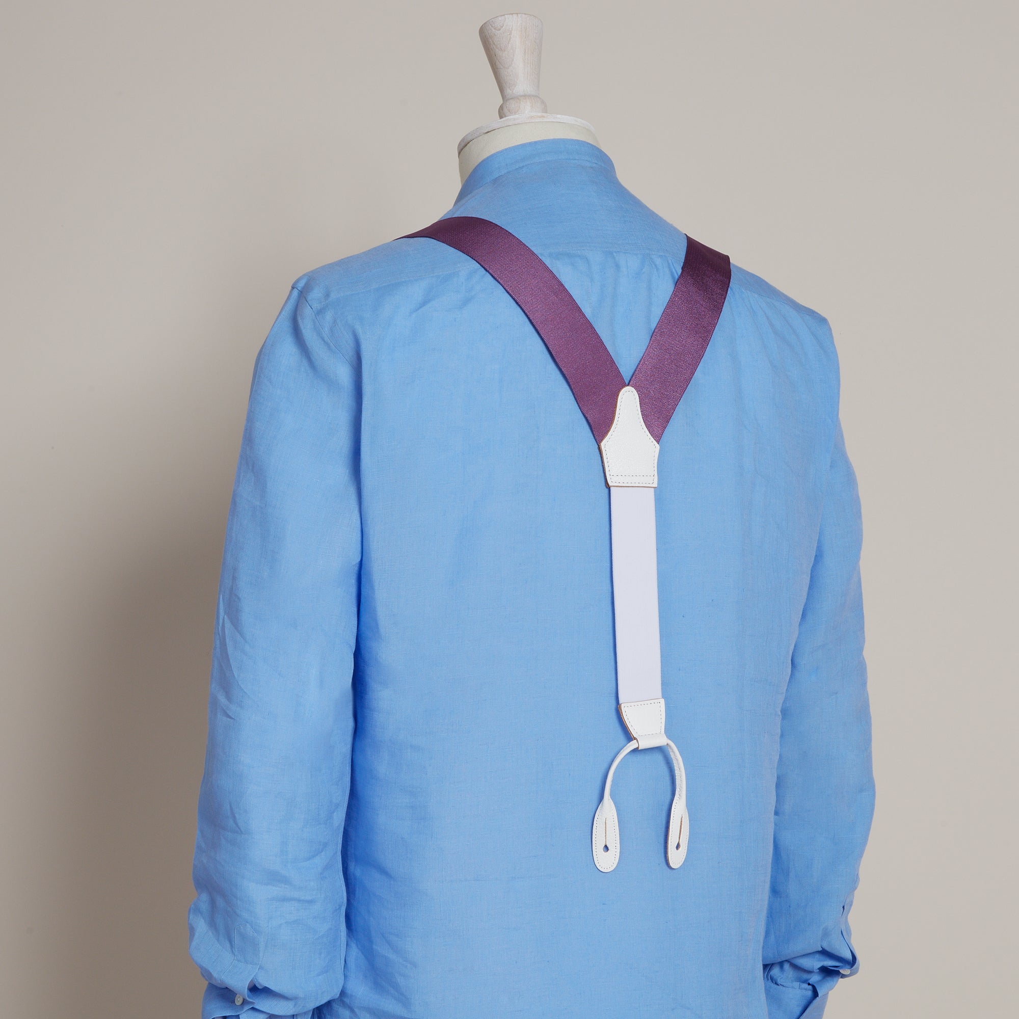 These elegant silk braces are handmade by the oldest manufacturer of braces in the world. The silk has a subtle, matt textured weave which is strong and durable. The braces have a traditional button fitting with leather ends. The length of each strap is altered by elegant, narrow brass adjusters.
