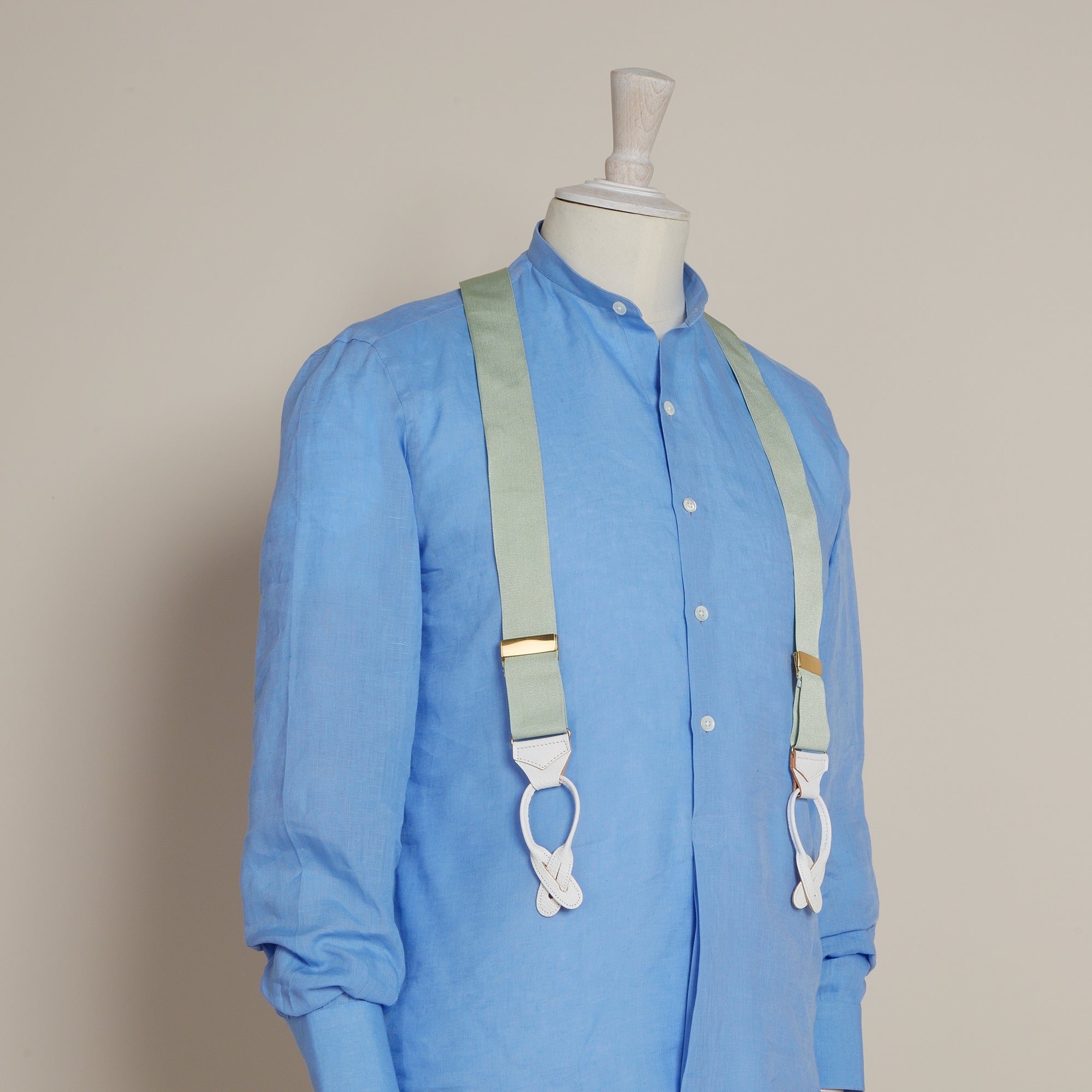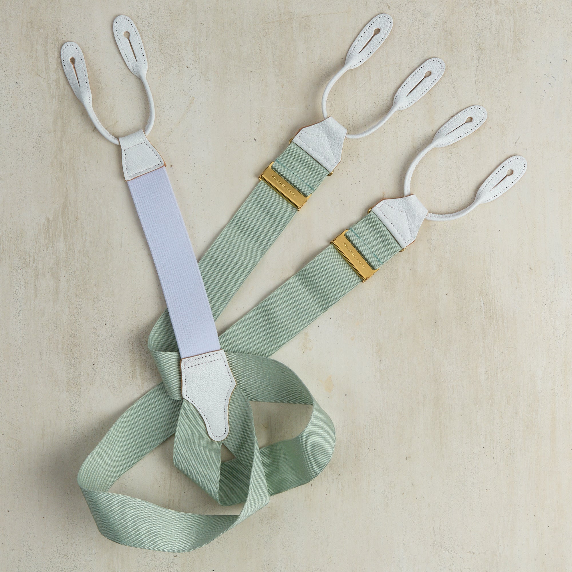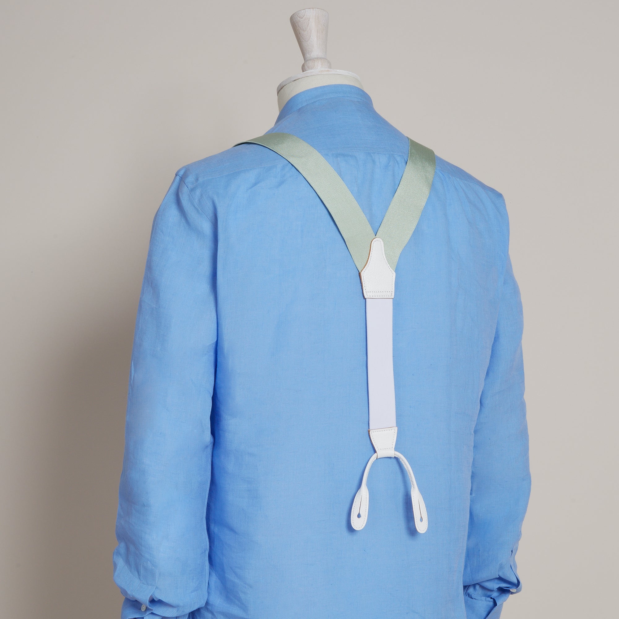 These elegant silk braces are handmade by the oldest manufacturer of braces in the world. The silk has a subtle, matt textured weave which is strong and durable. The braces have a traditional button fitting with leather ends. The length of each strap is altered by elegant, narrow brass adjusters.