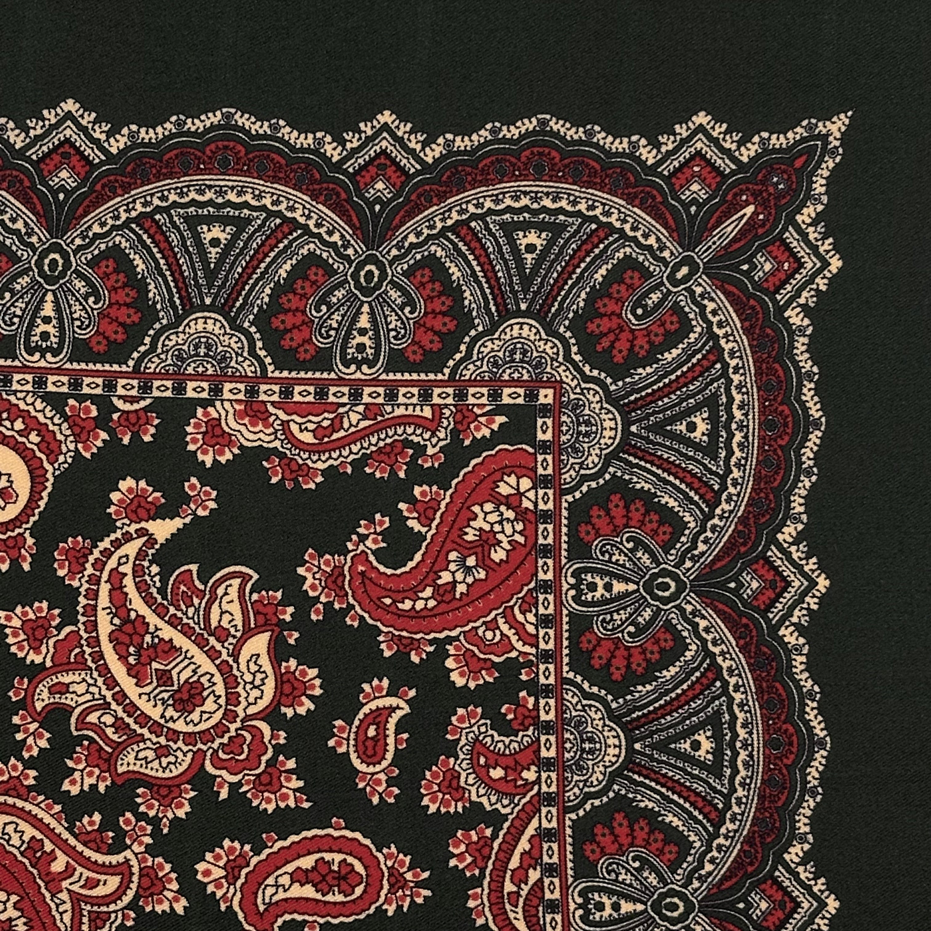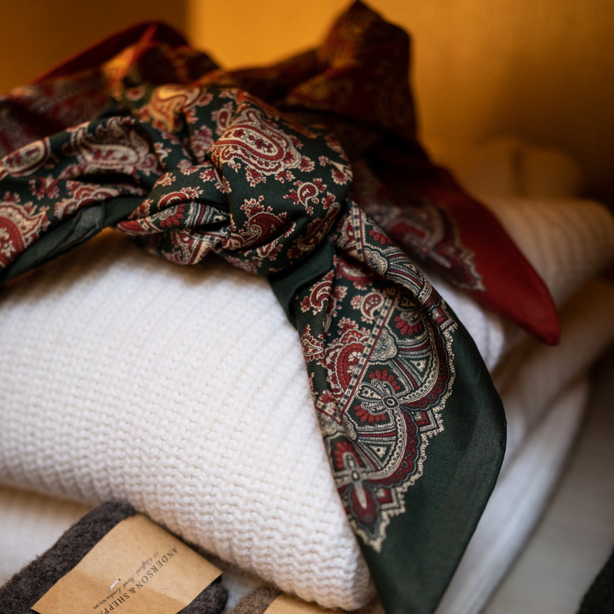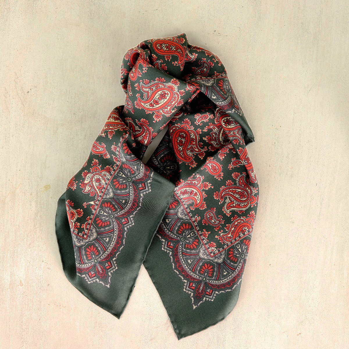 This jolly paisley neckerchief in dark green and burgundy is the perfect accompaniment to your outfit all year round. Screen printed on silk it can be worn in a variety of ways.
