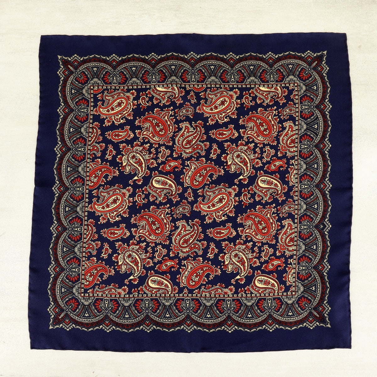 This jolly paisley pocket square in navy and burgundy is the perfect accompaniment to your suit or blazer. Screen printed on silk it can be worn in a variety of ways.