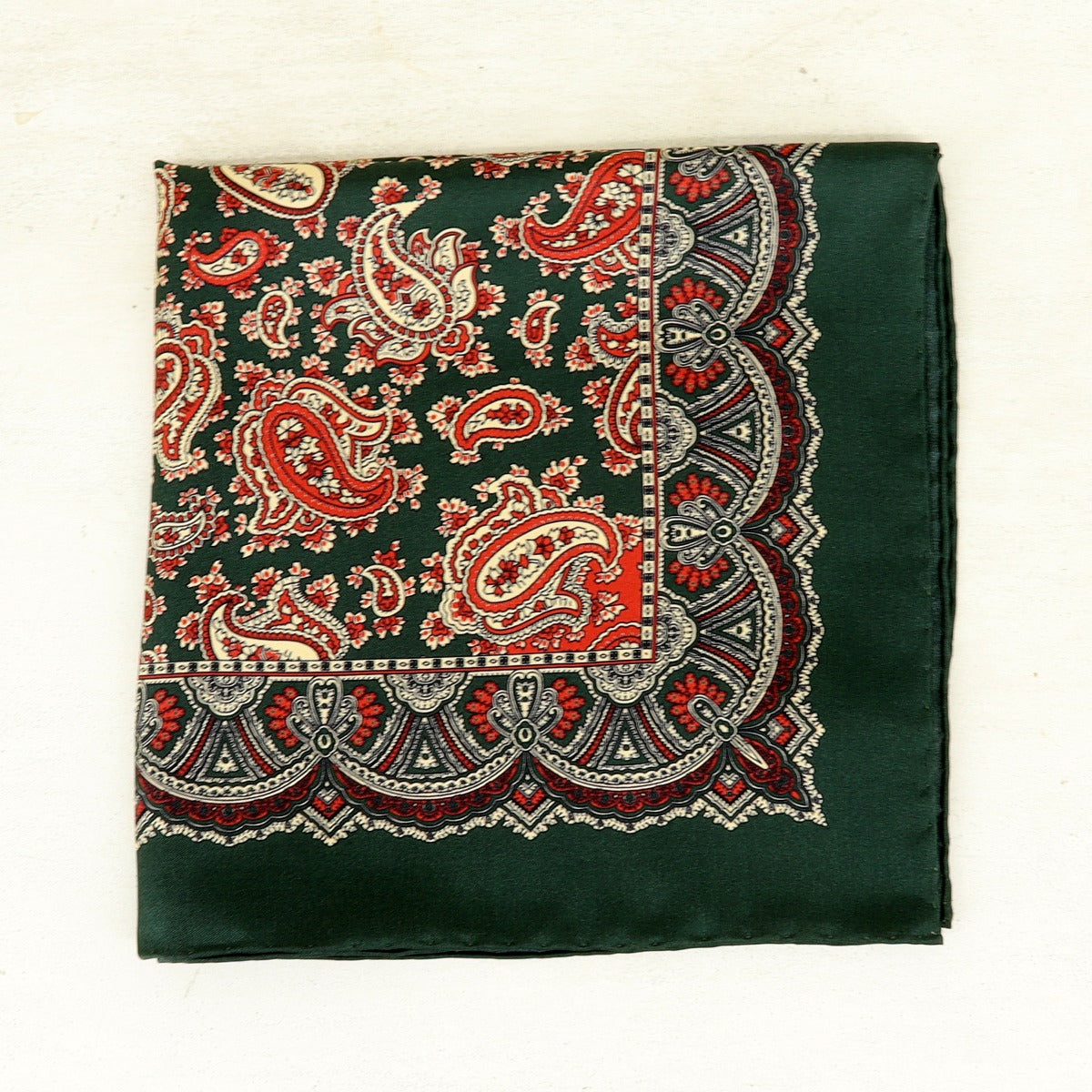 This jolly paisley pocket square in deep green is the perfect accompaniment to your navy suit or blazer. Screen printed on silk it can be worn in a variety of ways.