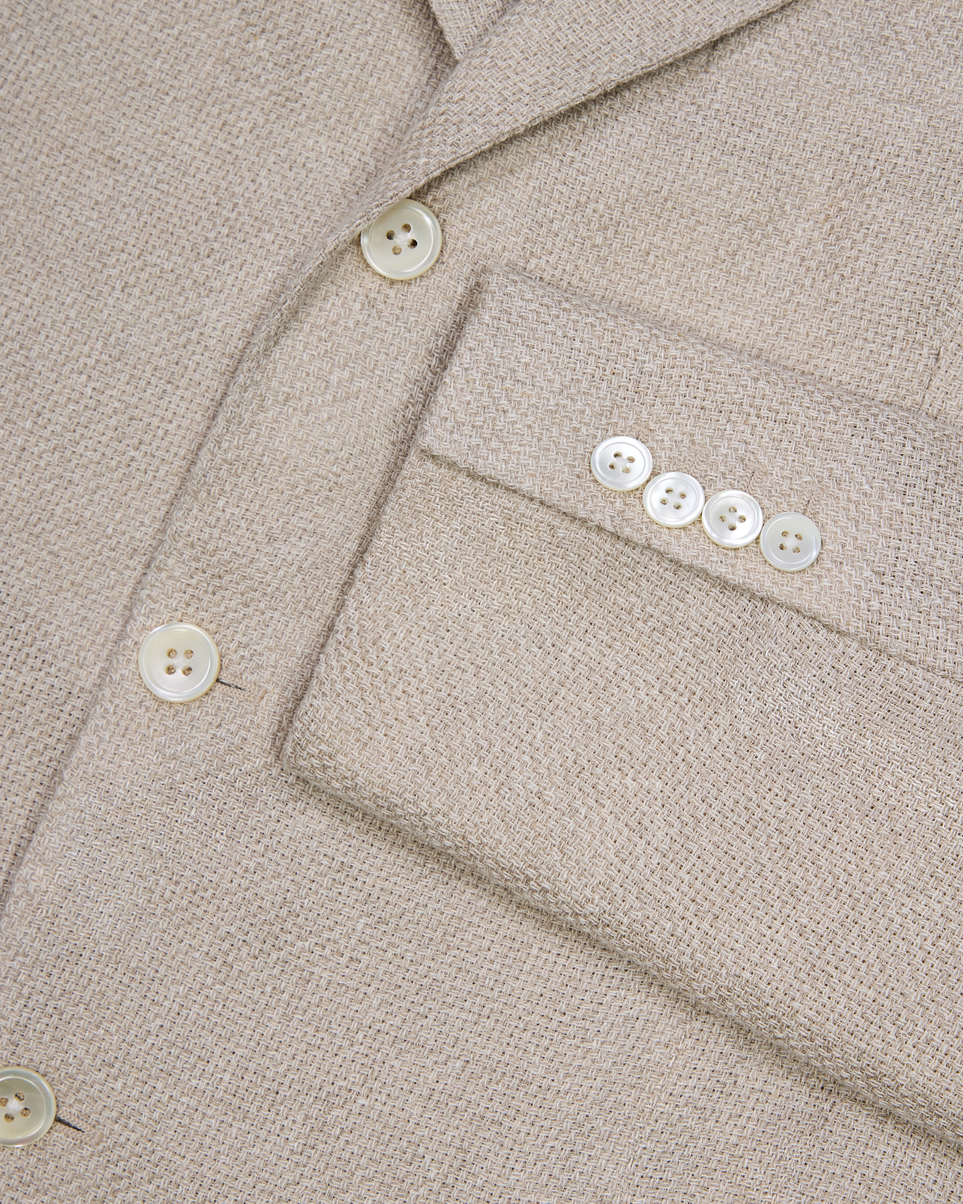 Featuring a notch lapel, patch pockets, two internal pockets and a four buttoned working cuff, this double-vented jacket has a classic, comfortable silhouette. The wool, silk, linen and cashmere mix is the perfect weight for Spring, Summer and early Autumn. We have lined only the sleeves to enable ease of removal of the jacket, and to keep it light enough to wear throughout the warmer months. The jacket can be paired with a shirt and worn with chinos for a formal look, or with a t-shirt, shorts and espadrilles for a more casual approach. Elegance and comfort, you can always have both!