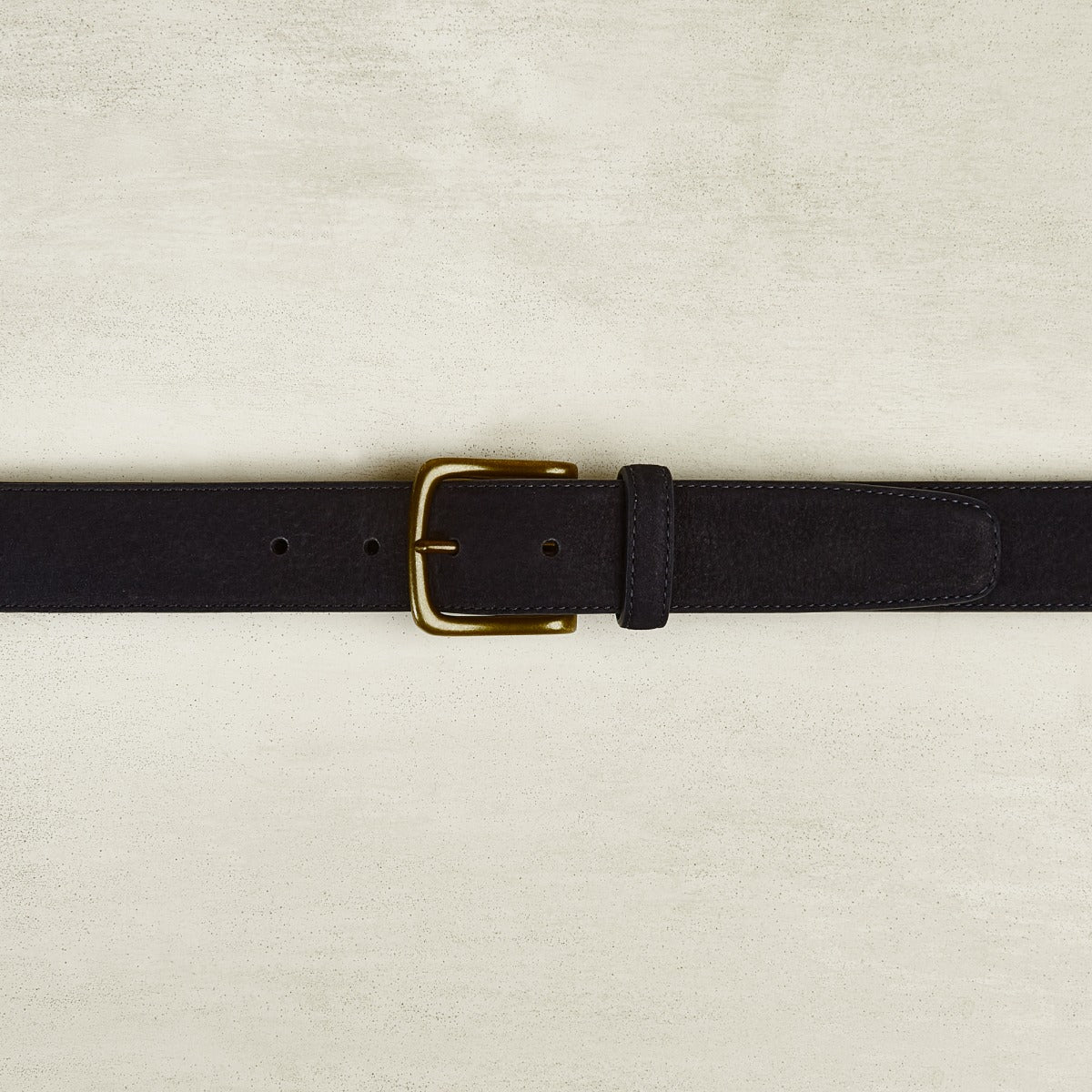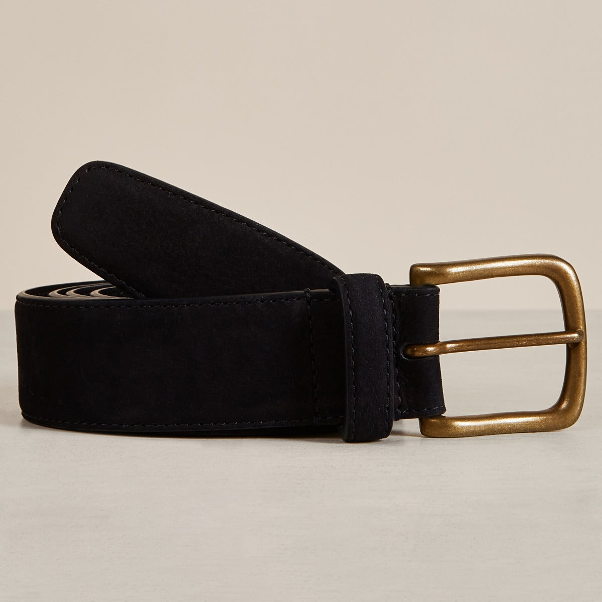 This soft suede belt in deep navy is the perfect addition to your accessories wardrobe and an item every man should own. Featuring top-stitched edges, an antiqued brass buckle and a single loop, this classic, versatile item will keep your trousers in place for years to come.