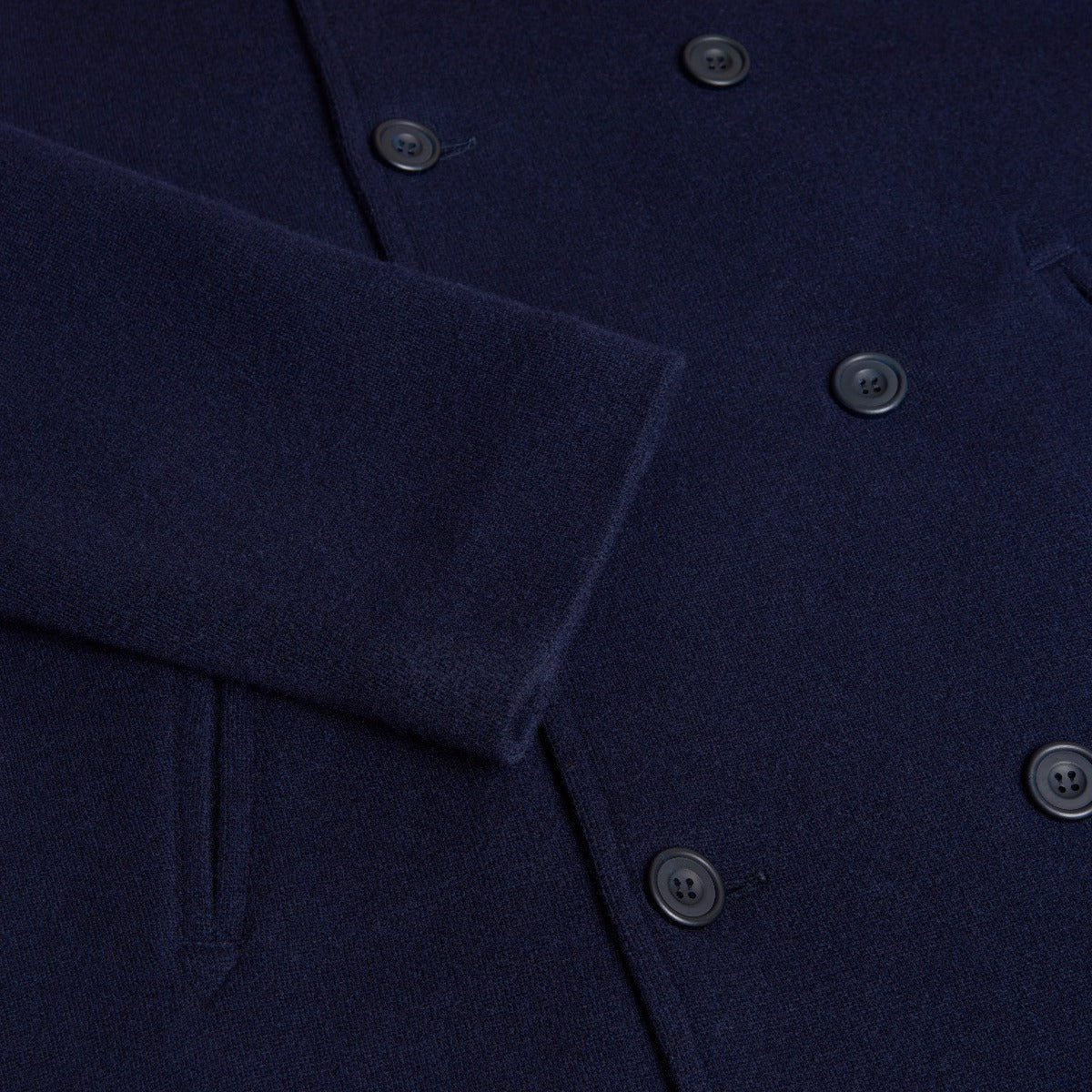 Knitted from wool and cashmere this unstructured pea coat is the perfect addition to your outerwear wardrobe. This coat is fully lined and incredibly soft against the skin. Featuring a generous collar, traditional double breasted front and two side pockets, this pea coat looks great with a pair of boots, jeans and a sweater or equally great over a pair of shorts and a t-shirt for a more relaxed look.