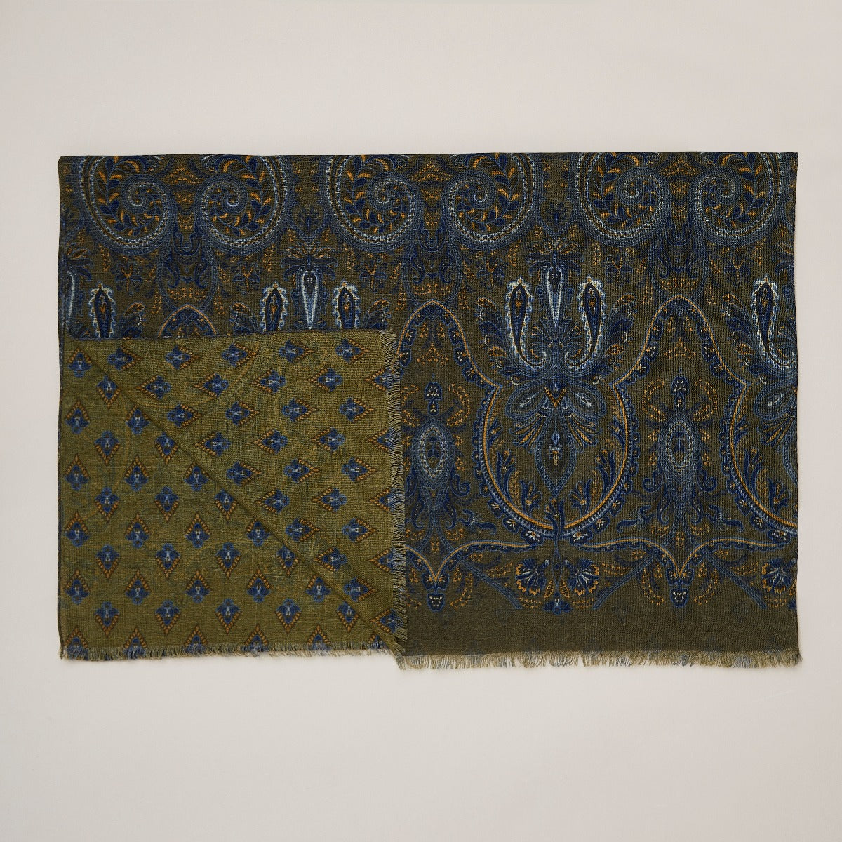 There is nothing as pleasing as paisley. Made in soft wool, this double-sided printed scarf features a wonderful pattern complimented by a simple fringed edge. This scarf adds fun and colour to the greyest of winter days.