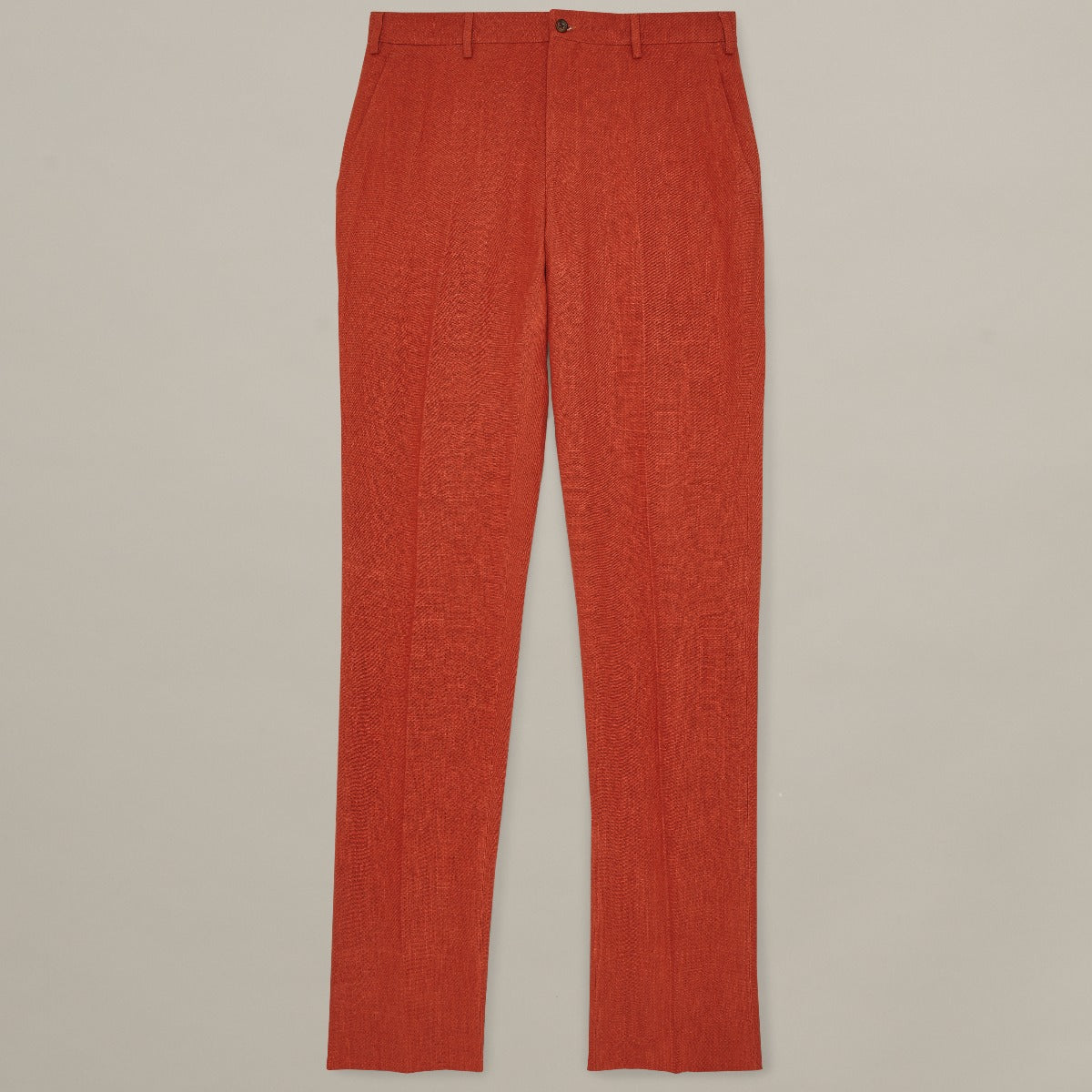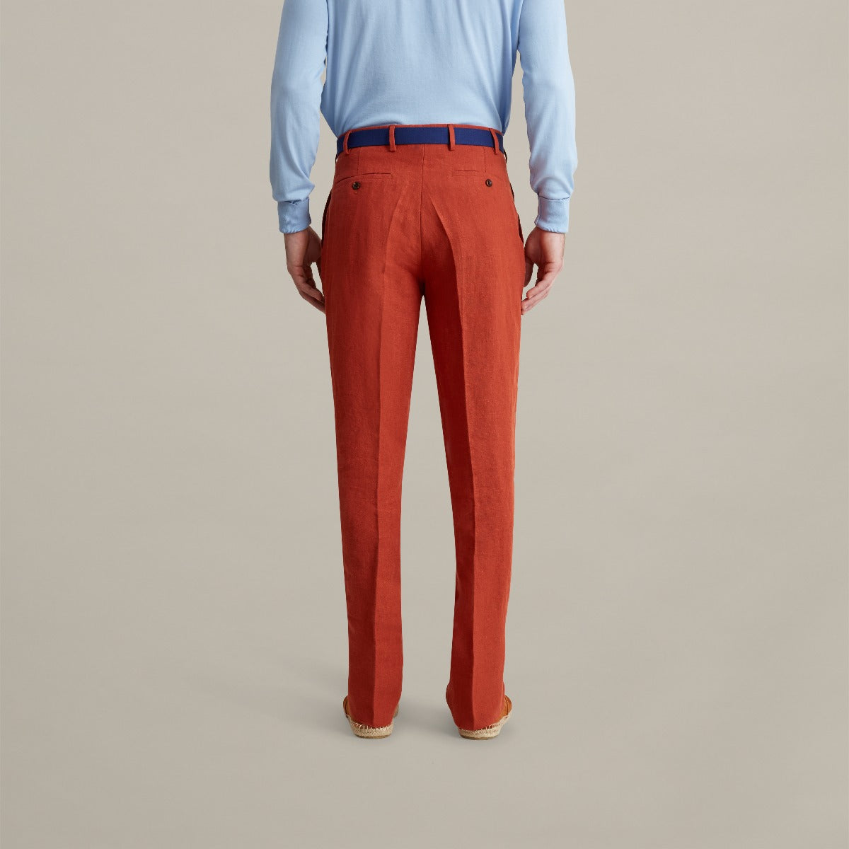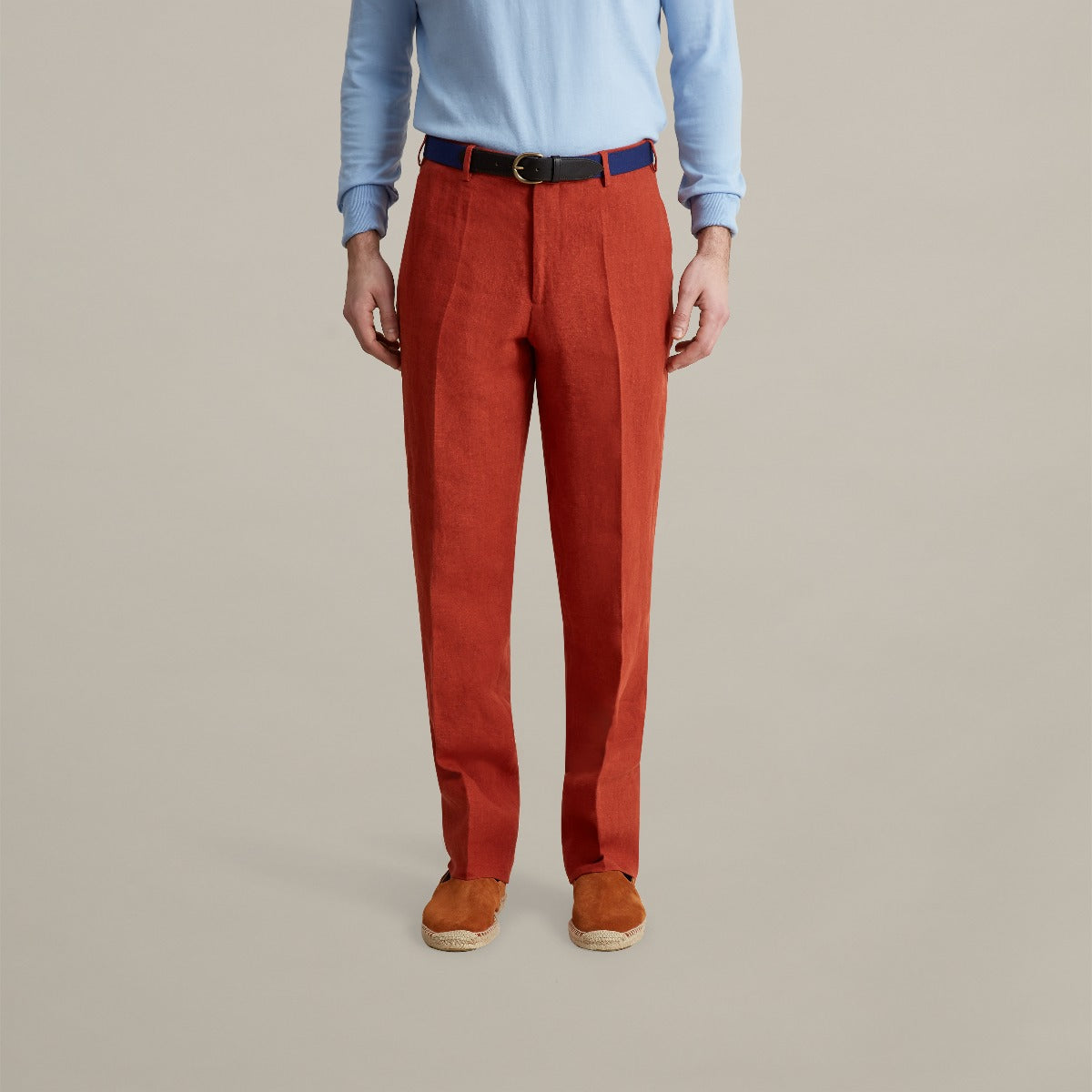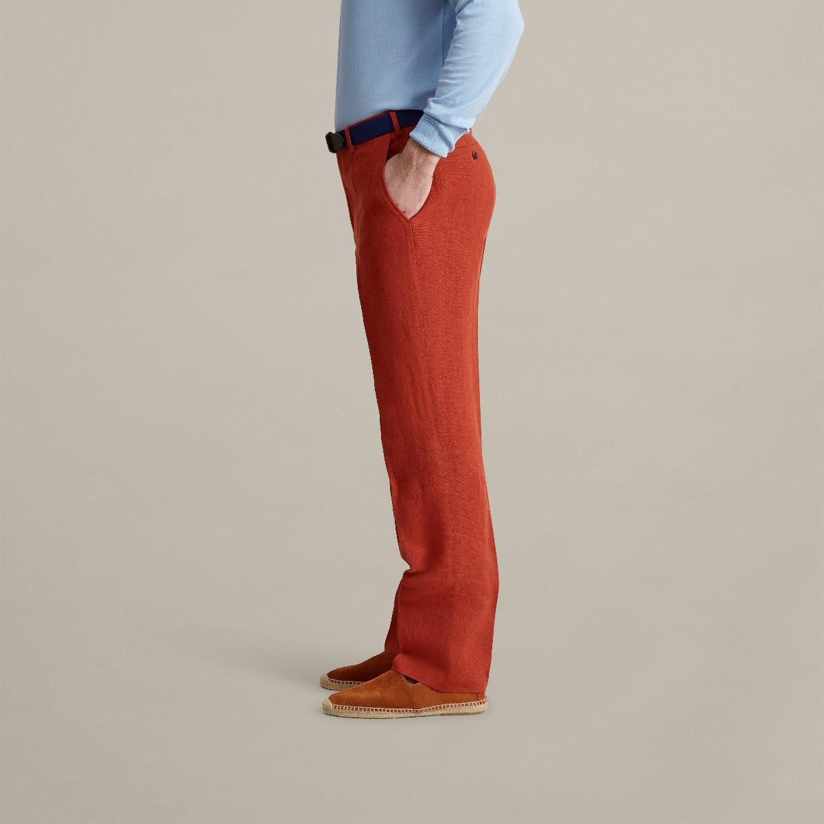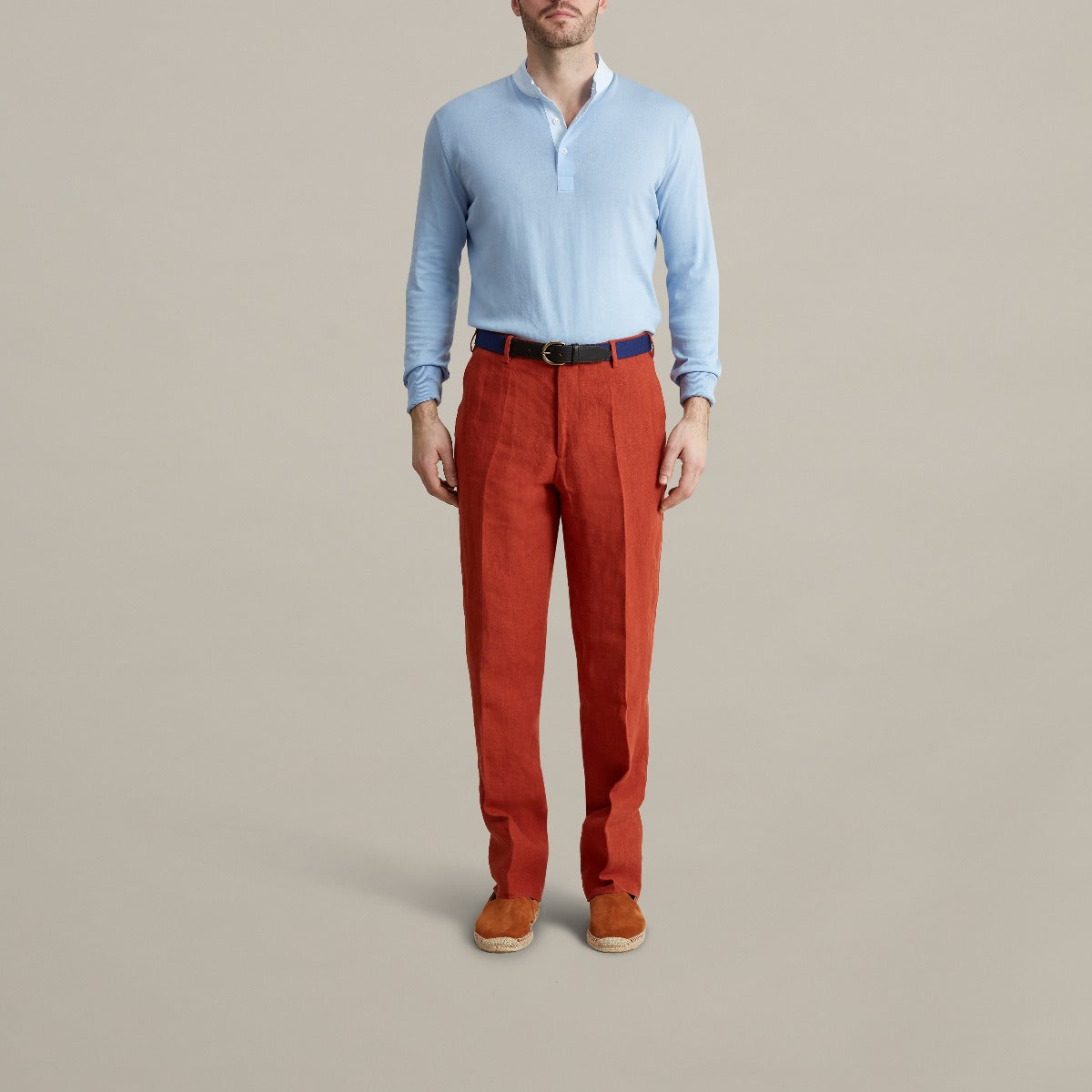 Shown here in brick Irish linen worn with our soft blue henley shirt.