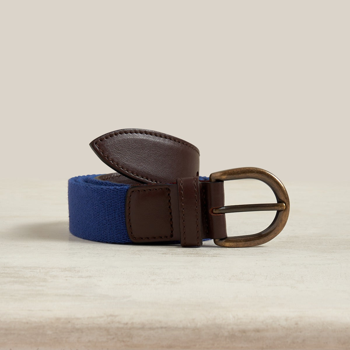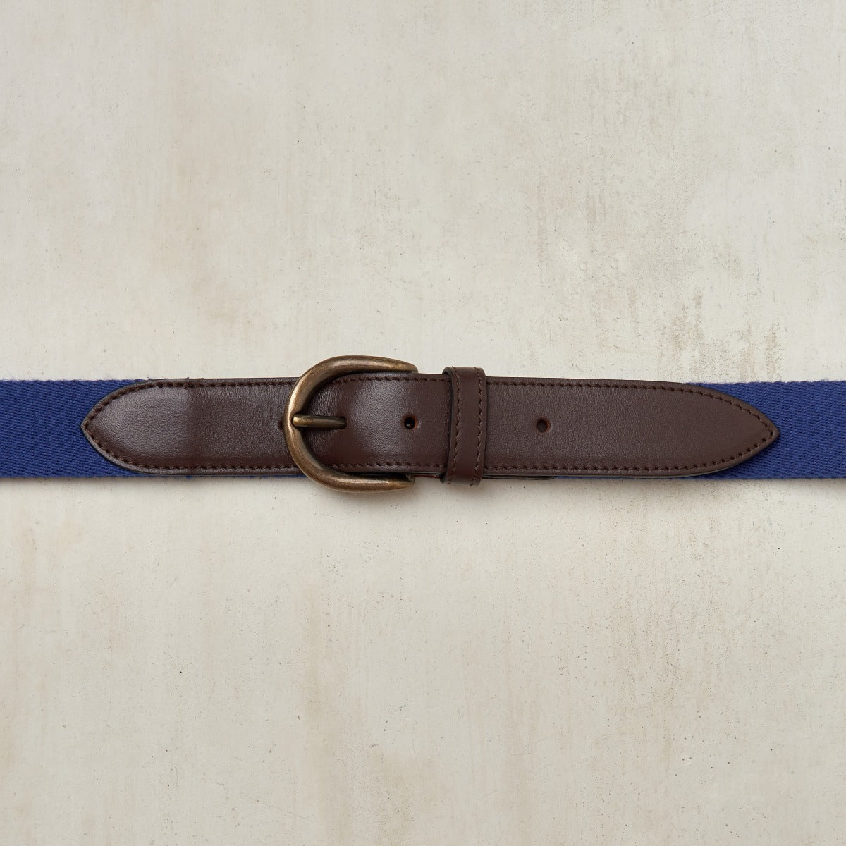 Whether worn with denim or casual tailored trousers, this versatile webbing belt is a great way to add a touch of colour to an outfit, whilst still being easy to coordinate with one’s shoes. Featuring brown leather trim and an antiqued brass buckle.
