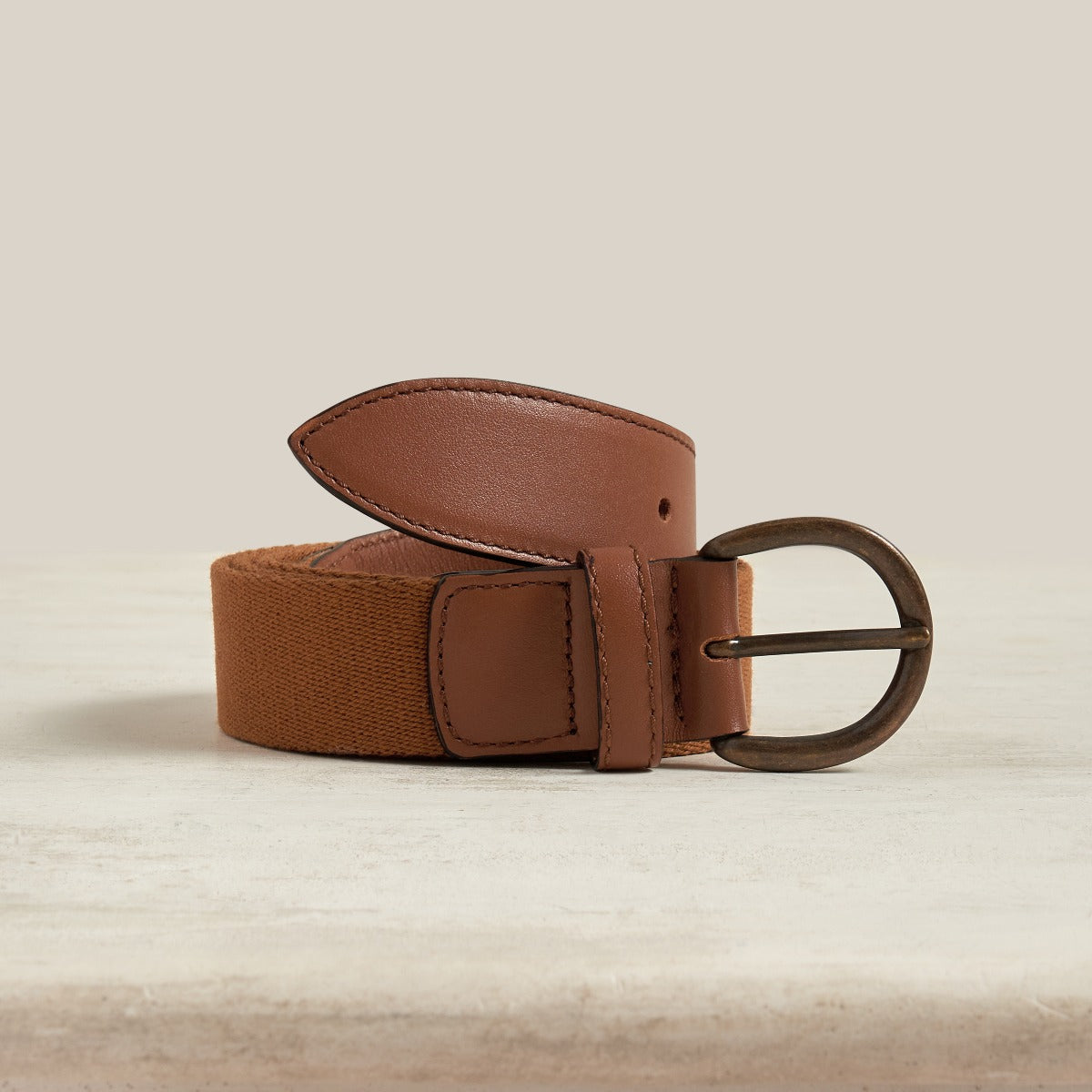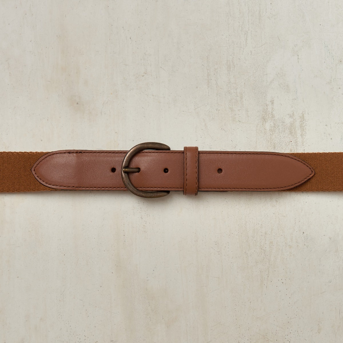 Whether worn with denim or casual tailored trousers, this versatile webbing belt in teal is a great way to add a touch of colour to an outfit, whilst still being easy to coordinate with one’s shoes. Featuring brown leather trim and an antiqued brass buckle.